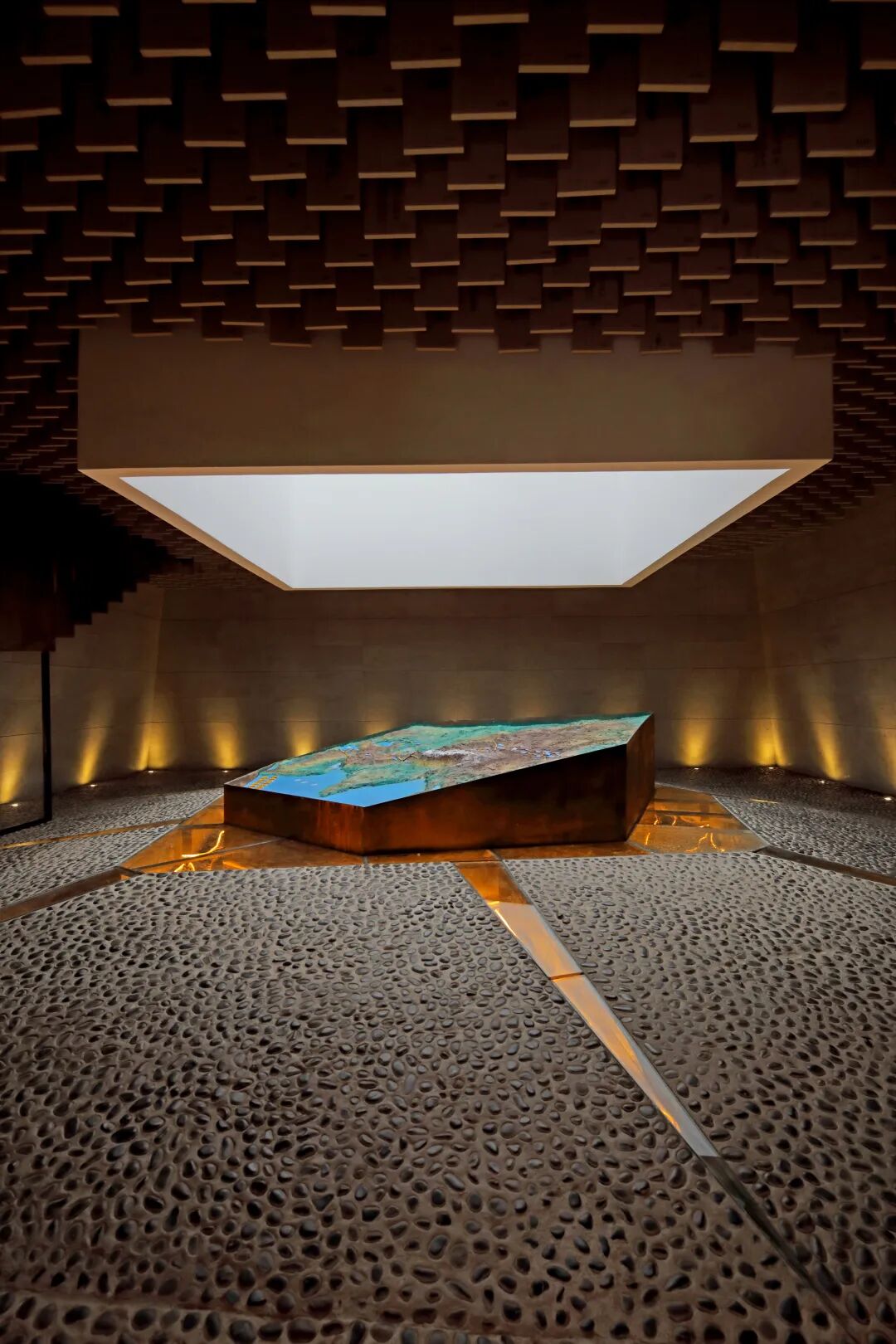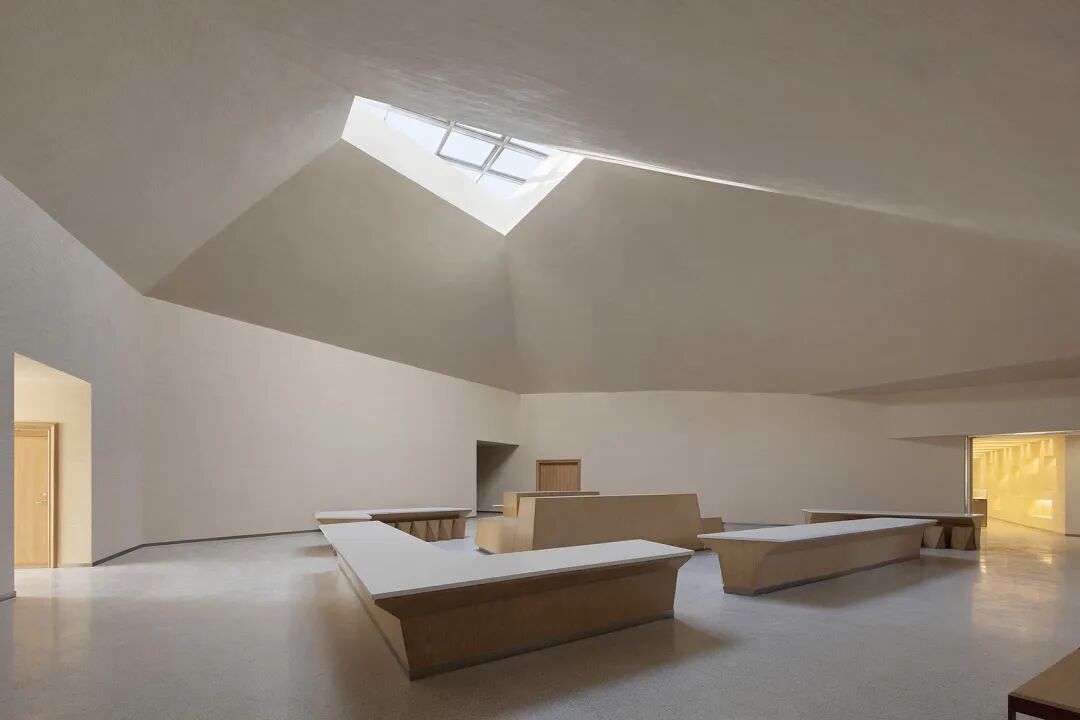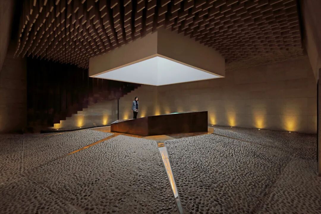 建筑内部构成类似莫高窟的洞窟式空间体验。在炎炎夏日,游人进入到由大屋顶与厚墙围合而成的大空间,可以在其中休憩。加上透过屋顶与厚墙的阳光,共同营造出身处洞窟之中的神秘感受。