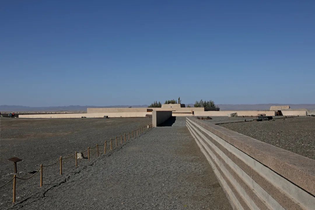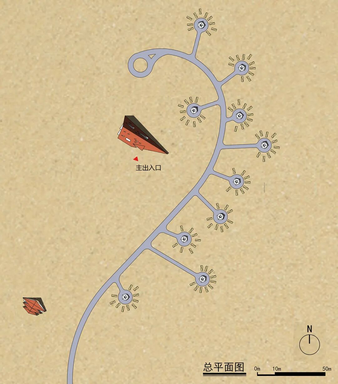 设计的出发点是将建筑与戈壁风貌结合,呈现出玉门关遗址的厚重感与戈壁荒凉感并存的场所。将建筑的体量尽可能的压到地下,这样一方面最大程度消解了建筑体量,建筑屋顶还原戈壁风貌;另一方面由于基地南北侧存在6米高差,建筑恰巧可以埋藏在这一高差中,通过覆土方式让建筑与环境融为一体。
