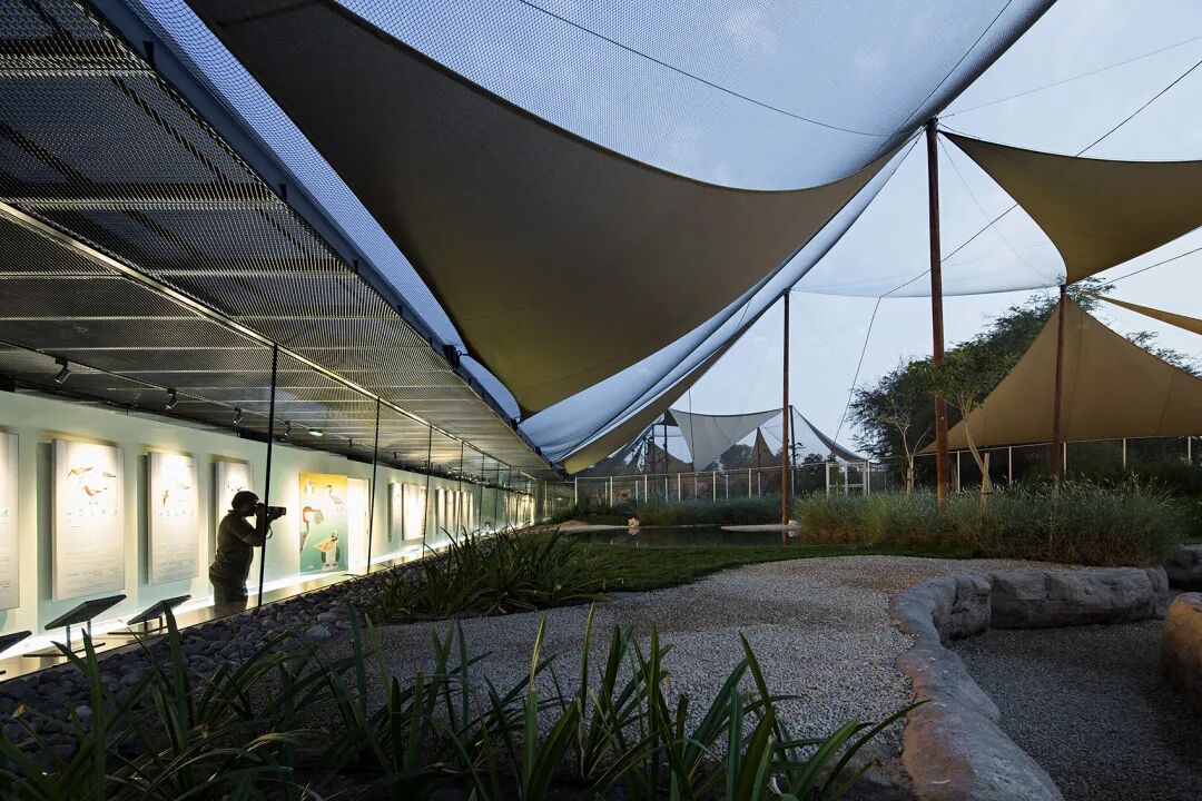 在这里,游客可以看到展示周边景观的室外抽象雕塑展品,并为他们亲身探索国家保护区做一定的准备。这个革新的手法可以使游客脱离室内环境,来到室外使用阴凉,蒸发冷却和大功率节能风扇等手段创造的舒适的微环境中。