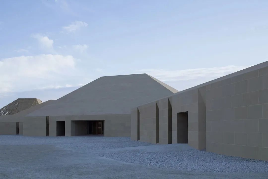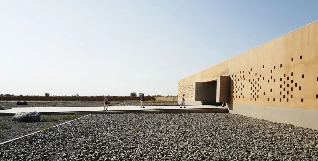 高昌故城以土为原料的建造方式呈现出构筑物融入大地的生长感,在游客中心的设计中我们同样再现出这种关系,以土为表面材料,封闭性很强的墙体既清晰讲述了建筑与自然的限定,也表达了不可割裂的生长感。
