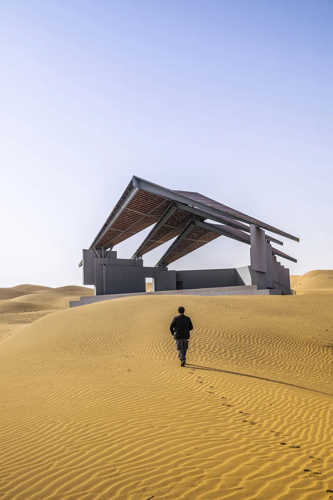 因用地限制,建筑沿西北-东南方向布置,总平面成类等腰三角形,底边朝向西北方的腾格里沙漠。建筑形体如同一个倾斜的,半埋在沙漠中的盒子。表皮由穿孔的锈蚀钢板覆盖。西北方向打开,采用通透的材料,形成室内外视线的交流。