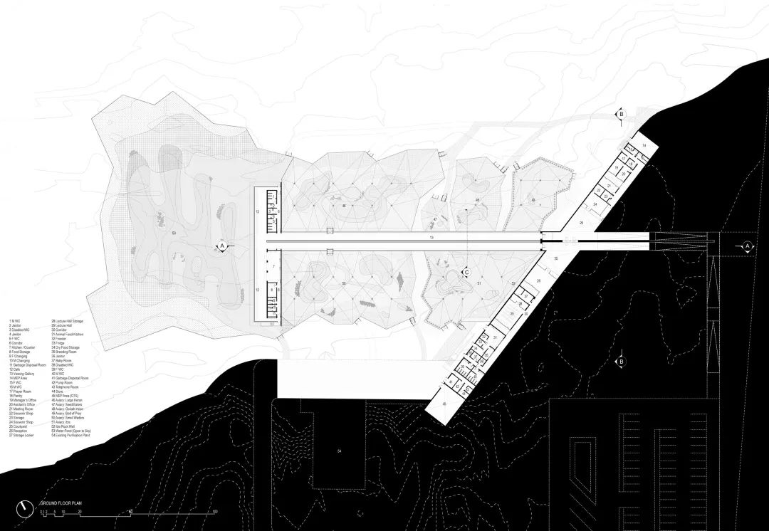 微微下陷的建筑深藏于环境之用,利用地形将其对自然景观的视觉影响降至了最低。游客将顺着小路,进入这个半下沉的线型建筑。全透明的玻璃幕墙将鸟类生活的自然环境毫无保留的展现在人们面前,而模糊的室内外界限让人仿佛身处其中,带来震撼的参观体验。