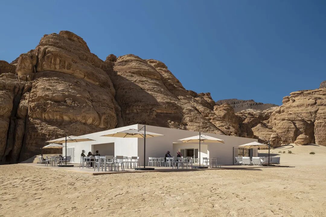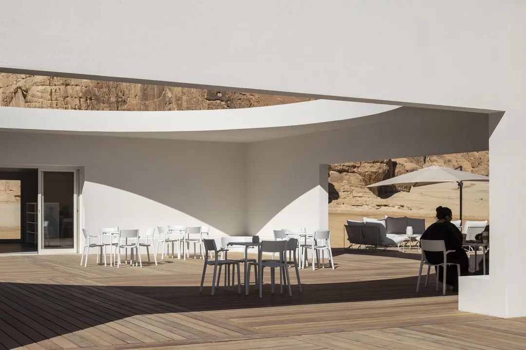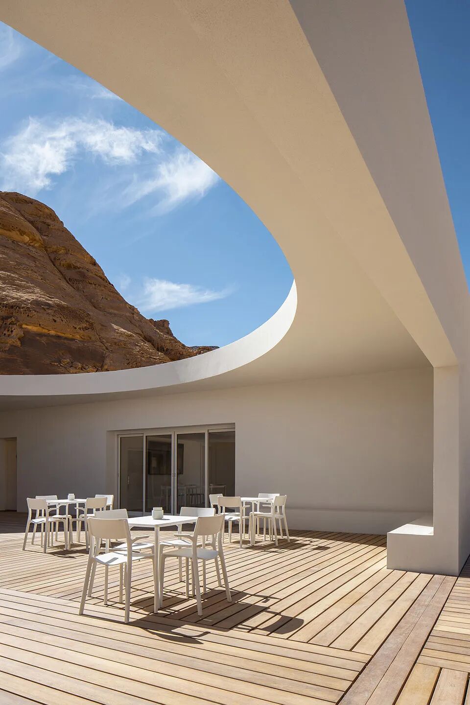 与风和阴影对应的还有若干半室外平台,使用者可以在平台上小憩,并观看沙漠的风景。锈蚀钢板上穿孔的设计有利于风的穿行,并形成戏剧性的光影效果,也为半户外空间增加了浪漫气氛。