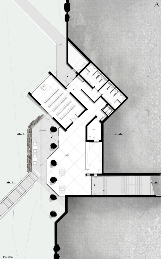 西立面将有趣的透明性同不透明的、轻盈与体量感相结合,为人们提供全景视野。立面由框架进行分隔,通过置入一排由当地玄武岩制成的巨柱实现,并通过独特技术处理使这些支柱作为支撑的结构要素。