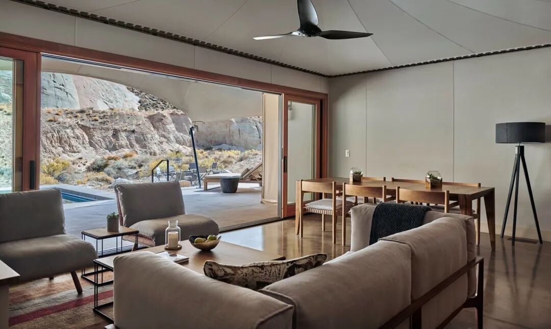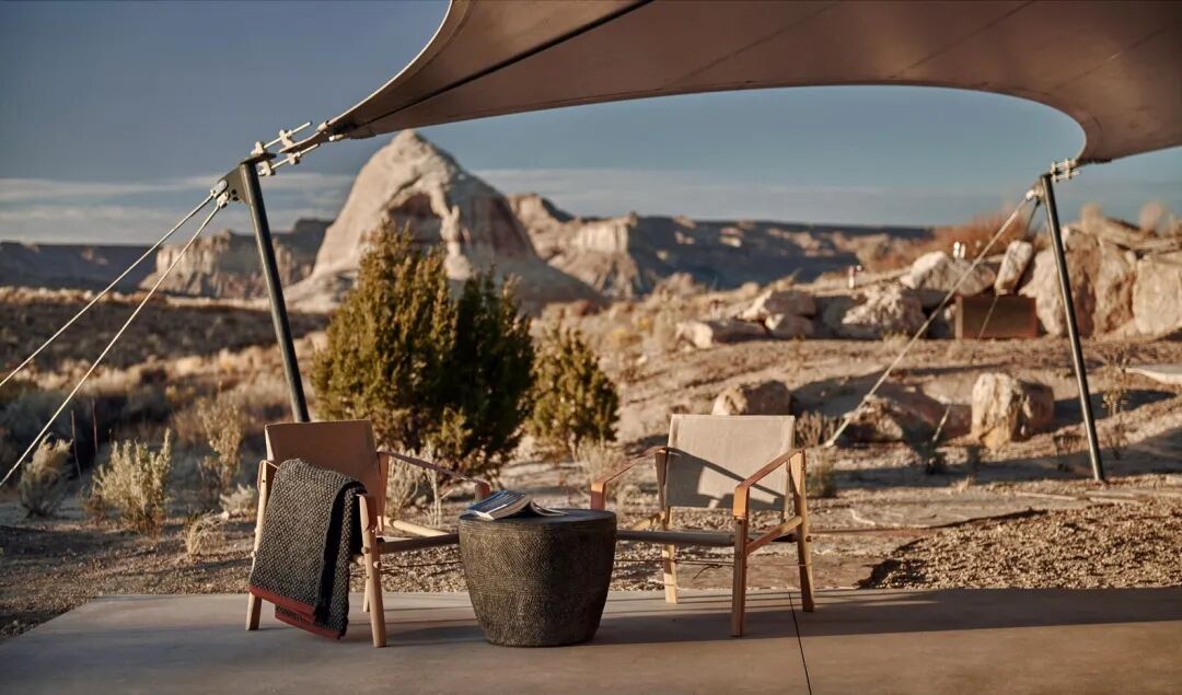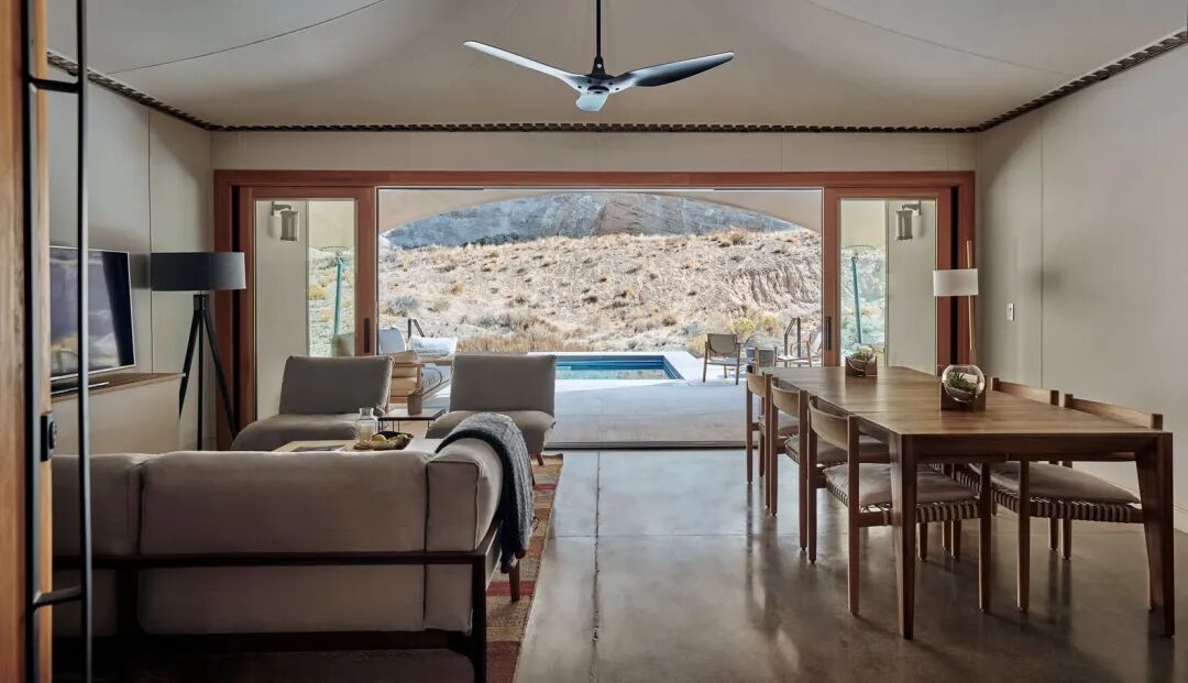 帐篷单元的室外区域同样美丽。穿过道格拉斯冷杉制作的推拉门,客人可以在私人温水游泳池中放松,在摆放着舒适躺椅的甲板上伸展,或者在篝火和炉边的家具周围聚集。甲板上的高度工程化的扩展帆布遮蔽了犹他州的刺眼阳光,使室内和室外空间无缝融合。