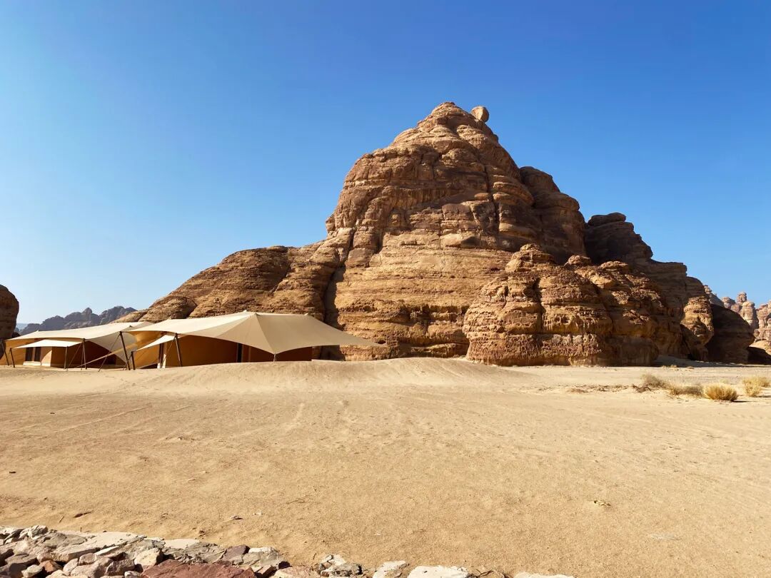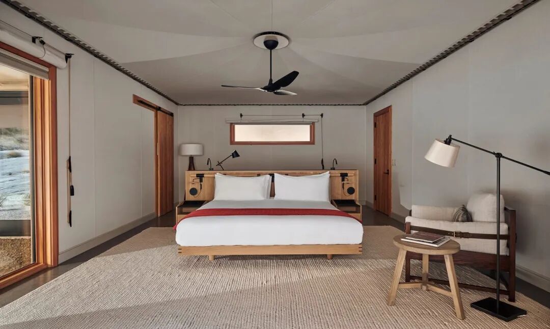 为了与设计理念保持一致,所有的帐篷都是舒适宽敞的,线条简洁,色彩自然。此外,营地精致的细节反映了本地的纹理和天然材料,灵感来自于沙漠的起伏表面。
