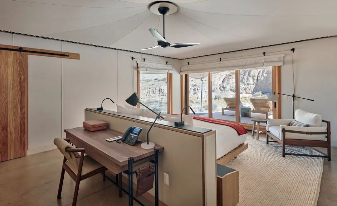 在帐篷内部,定制的营地风格的胡桃木办公桌配备有抽屉,边上挂着放杂志和资料袋的皮革袋,并配有一把定制的活动椅,上面有精致的皮革装饰。大床和双人床的蚀刻木质床头参考了周围的雕刻景观,并以挂在皮带上的柔软坐垫作为装饰。