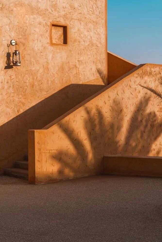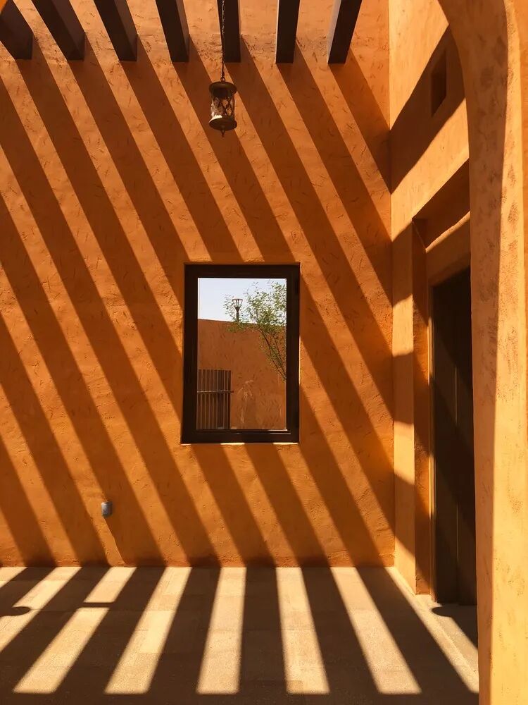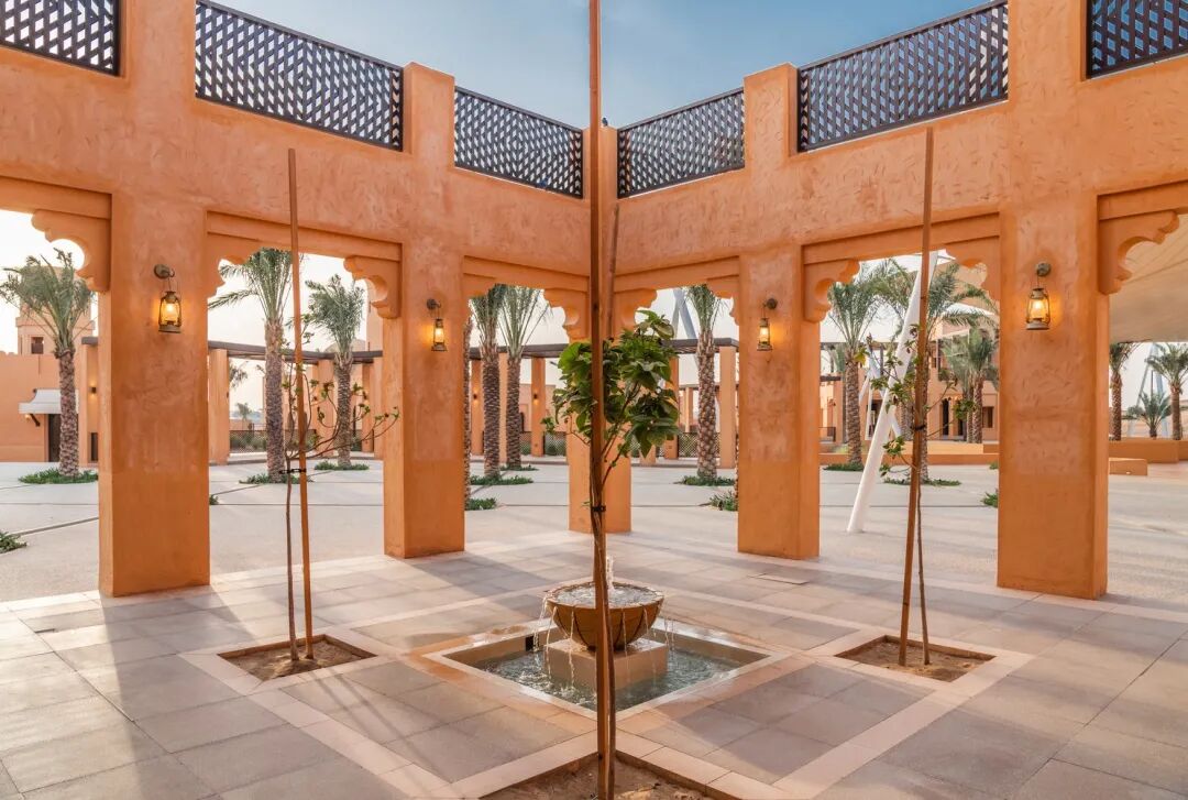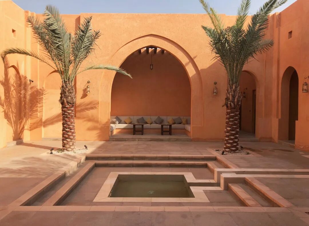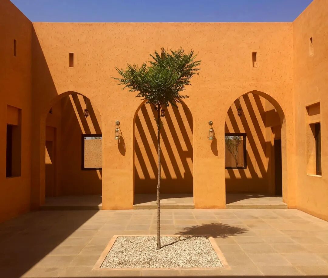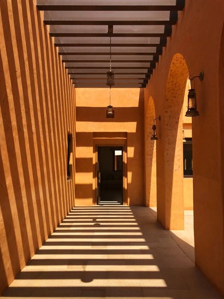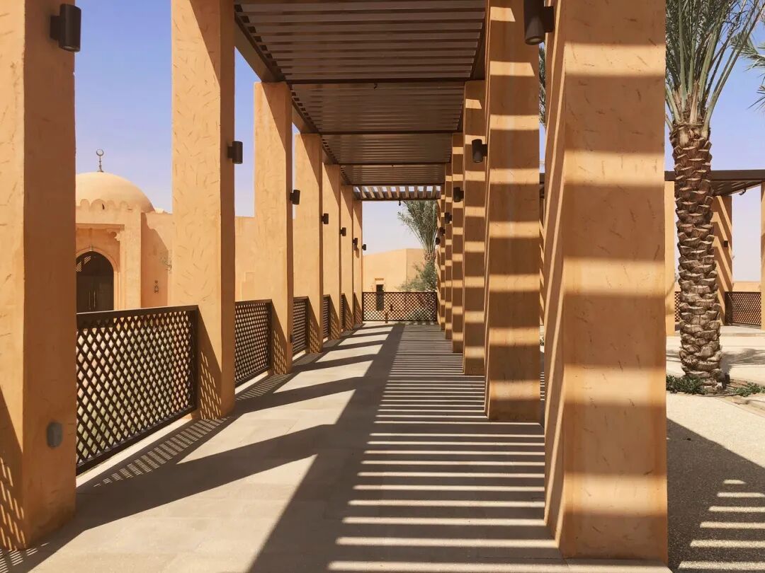 当地的传统建筑类型被用于建筑设计中,包括庭院、拱廊、拱门、木制镂空窗、装饰元素等。建筑墙体的颜色代表了沙漠的橙色,而高高的拱廊和凉棚则加强了明暗对比。在这个文化异化的时代,这种做法有望提高人们对本土可持续建筑的认识,包括文化层面和环境层面,同时也能提高人们对始终具有重要意义的建筑遗产的认知。