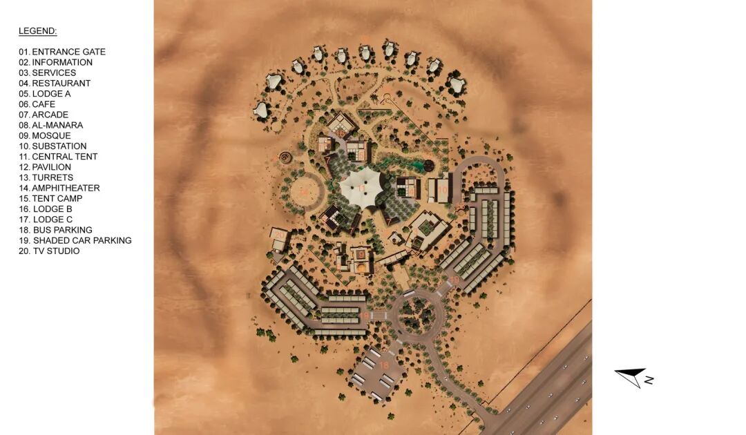 项目的构图是严格按照八角形几何逻辑进行规划的,以大型庆典帐篷为核心,向外辐射出多层次的建筑和景观元素。这种放射状的、漫画式的总体规划构图看起来像是对广阔而连绵的沙漠景观的赞美。