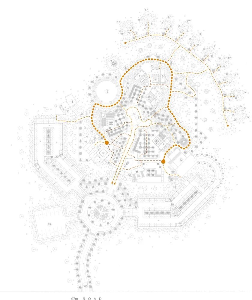 度假村的设计尊重自然景观,并最小化了其占地面积。为了强调宽阔场地上“轻触式”的设计方法,度假村内的道路与人行道都被设计成为沙漠上的小径;客人们将穿过沙丘,并与自然亲密接触。因此,度假村的占地面积被减少到了最低程度,同时也保留了场地内的自然栖息地。此外,项目使用了当地资源、工艺及矿物材料以减少其碳足迹。