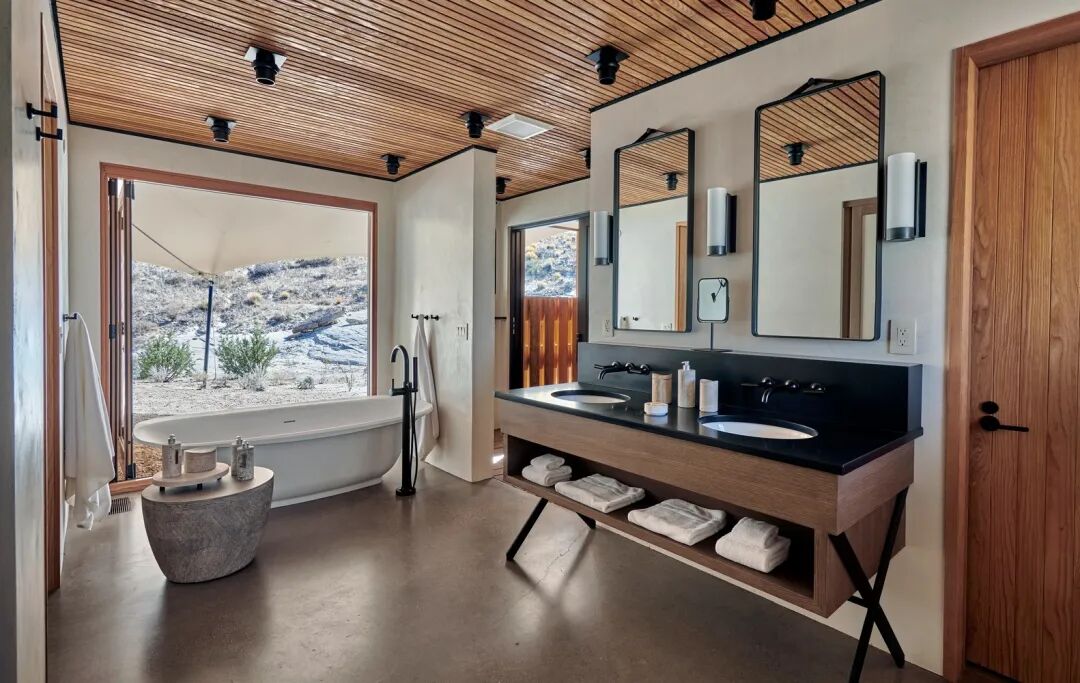 帐篷可以一览无余地看到东部的岩石或辉煌的西部日落,让人对大自然有一个难忘的体验。这 10 个单元平均分为一室和两室的户型,每个单元都配备了一个起居区、用餐区、湿式和干式酒吧,以及带有浴缸、室内和室外淋浴的私人浴室。