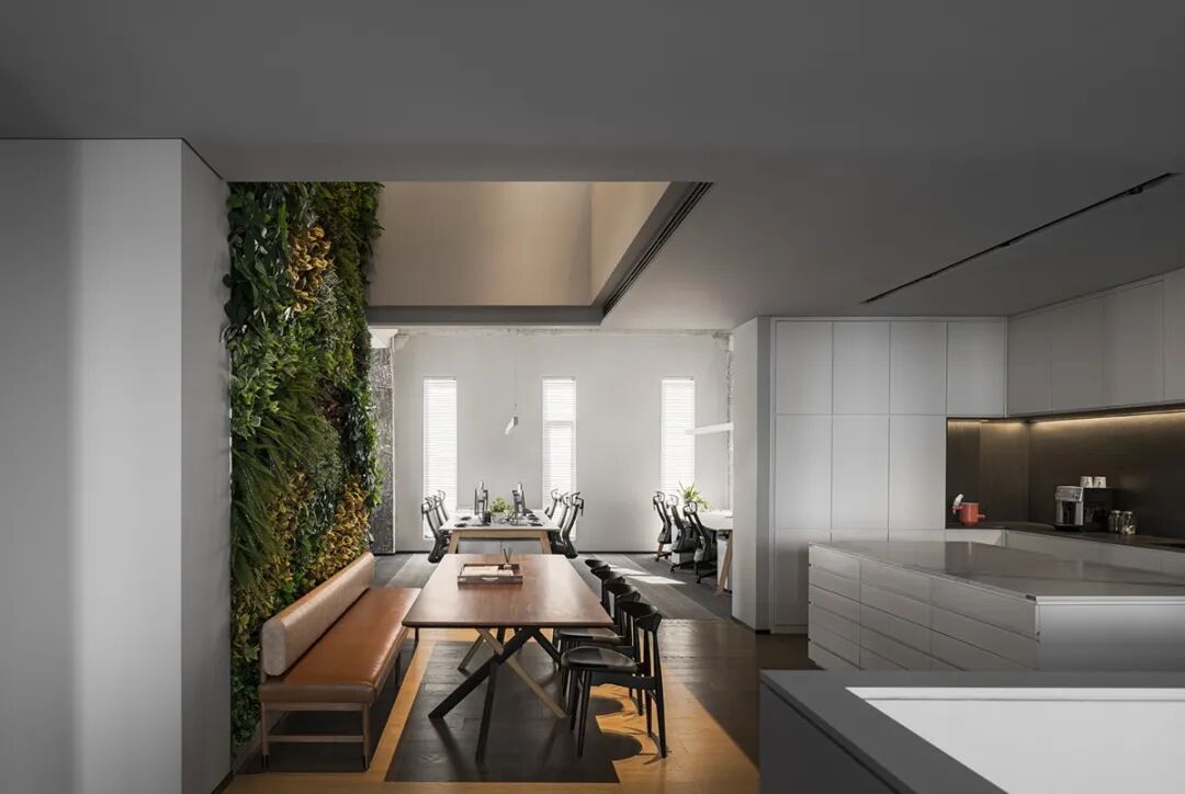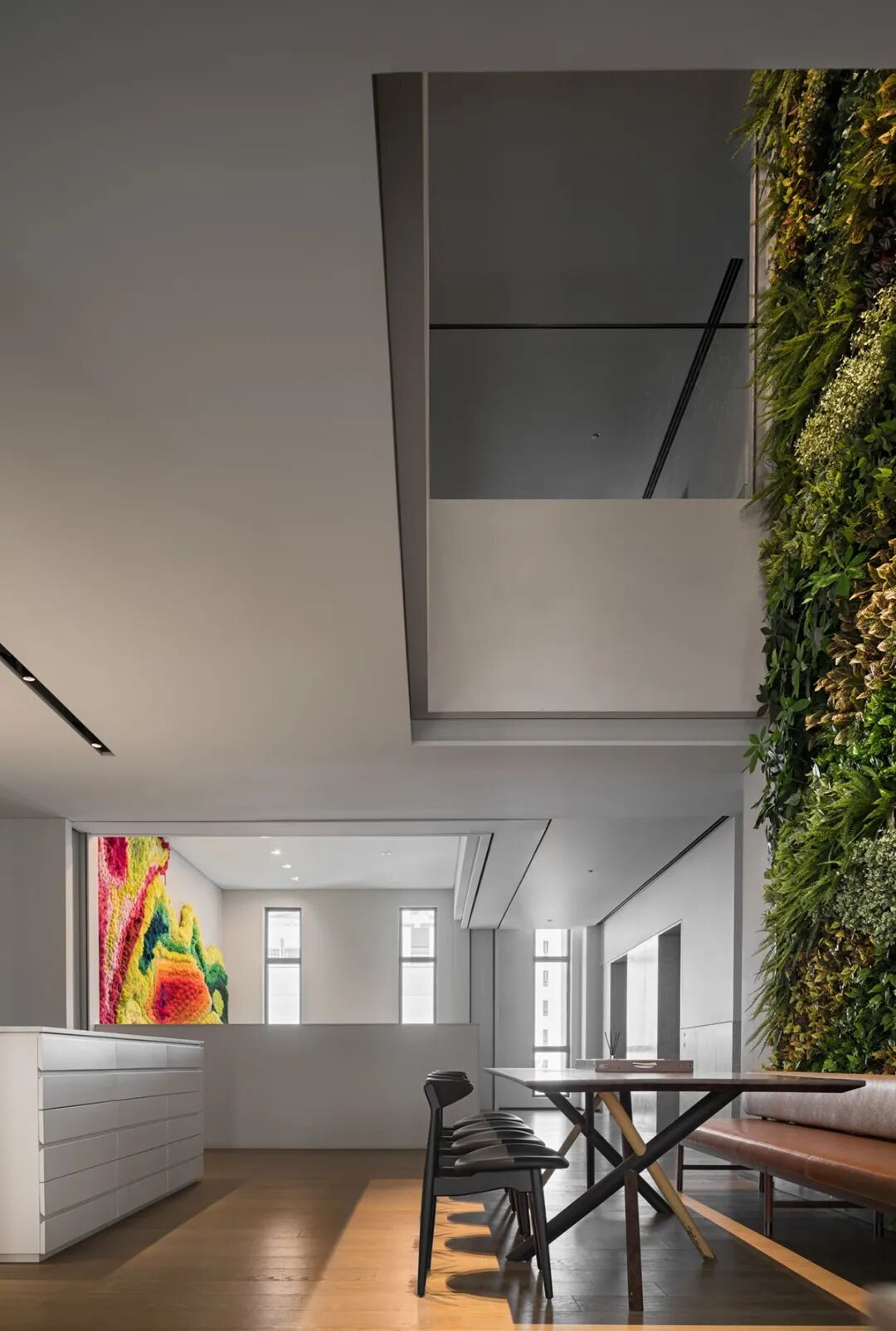 三楼的水吧间,用一整块整植墙与艺术作品呼应,并充分考虑其绿植面在绿植下和对立面的形态不同,用长沙发椅保证设计师植墙的整体性。