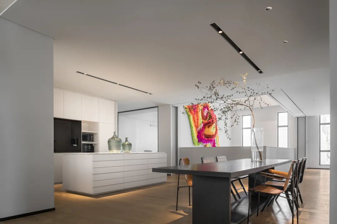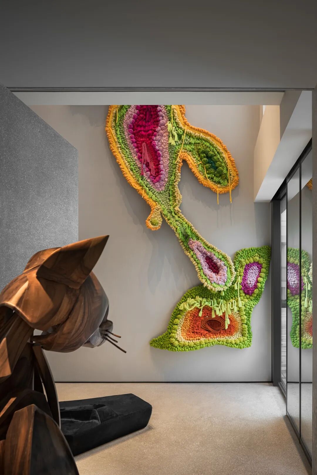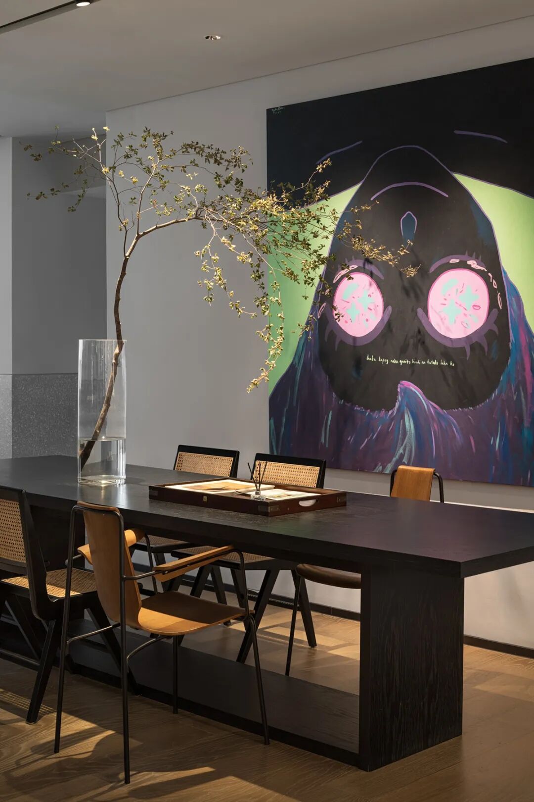 近距离,近14米的艺术启蒙幕,沉着灰域设计的几件作品,用有机的黑白色的静谧空旷的作品和生命呈现出纯粹的层次和色彩。楼上的一个视线,在空间释放出极简的信号时,消除了其中一味的工业风带来的每一次凝滞和空旷。