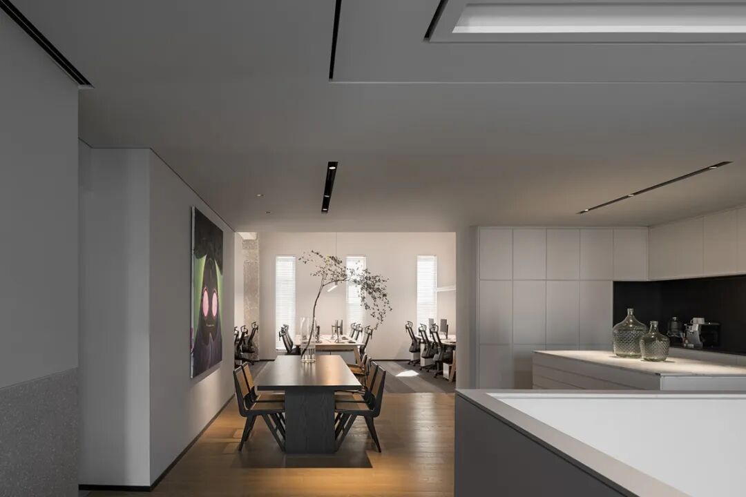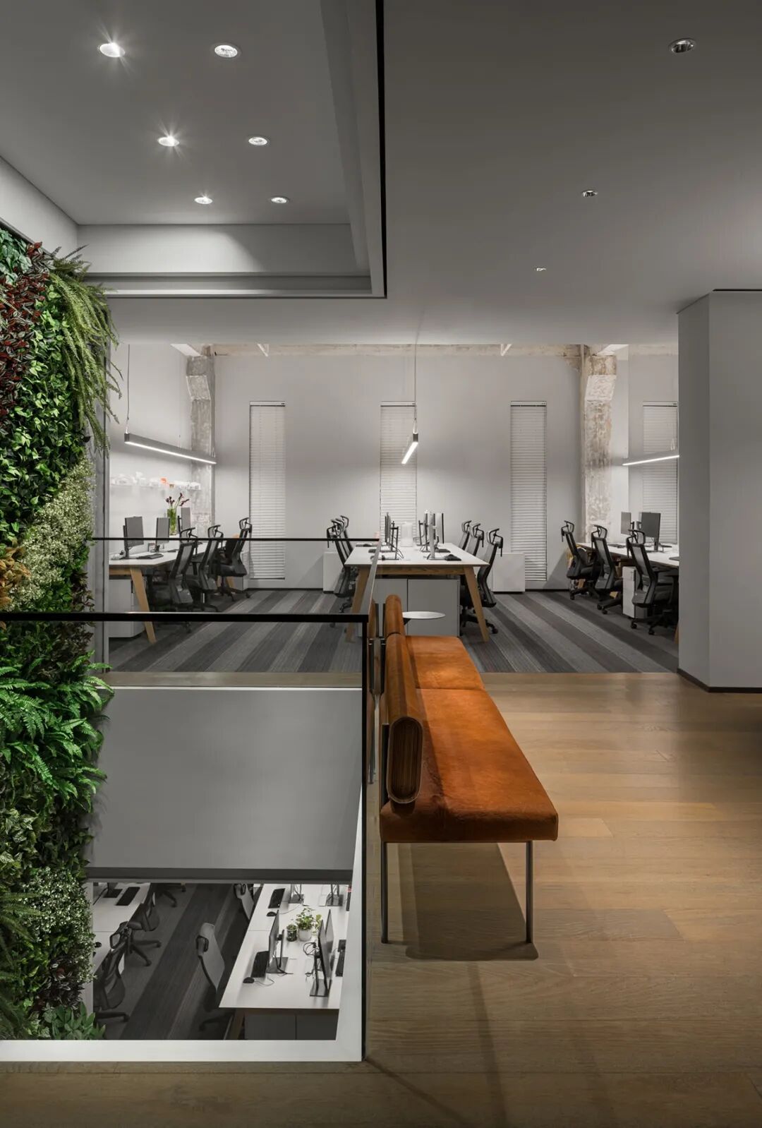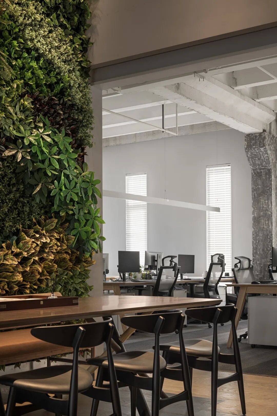 梁柱似的圆形标志,与粗矿的理相相映,形成了精细的精细精细。大地色的绿植和各种深浅不一的中性灰色,带来工作区域的宁静和浅浅的氛围。