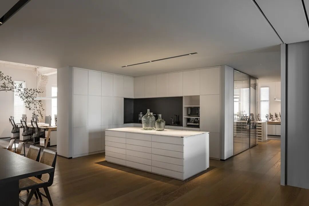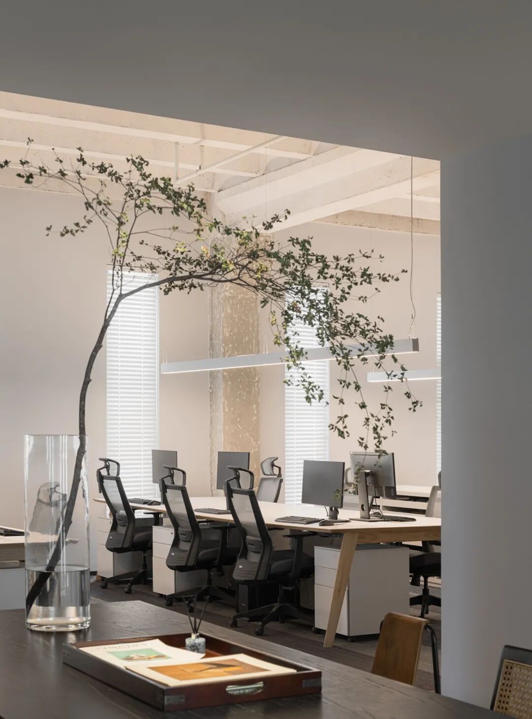 阳光最为充足的大留宿给员工带来了依赖,设计师并不执着于用处处装点在窗内,将更性化的树枝空间染成,隐喻着常青的生命力。