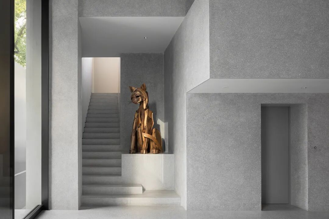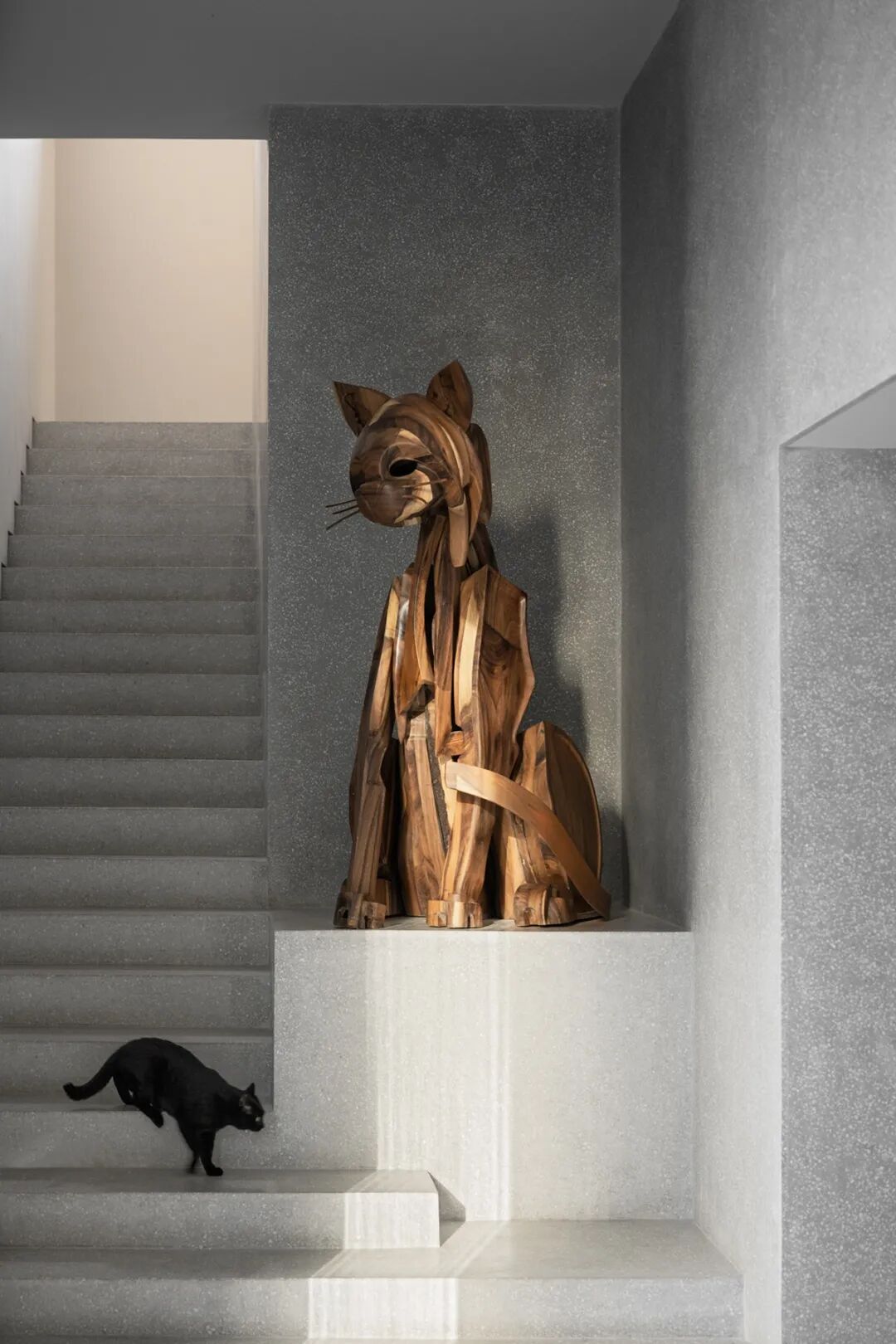 而在以方式的展示里,作品的艺术创作,艺术馆的规则体块的猫雕塑,木制的围墙沙发,沙发的不露脸,于几何体的和前台,无不在空间进行着。