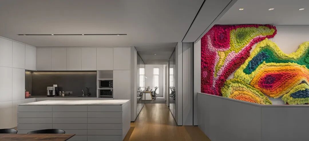 二层的员工位和水吧台附近的走廊空间,应有机的颇具生命力的艺术作品延伸至此,并与吧台对面的绿植相呼呼。