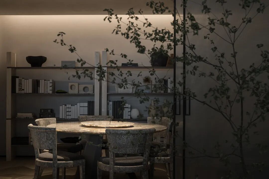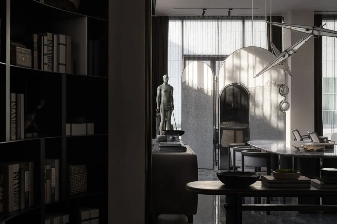 画作的描画,被帷幔的多层内嵌形成网格的拱形镜面,倒映壁龛的多重弧形空间的直线与圆弧着屏着双屏风,形成多维度的线条,形成多维度的线条小曲,诉说着巧思和意趣。风边的两盏圆形灯盏,一起开启时,与镜中又的壁橱在一起,是另外一番风景。长桌的上空悬着的半透明显示器,交错的形态,让我们在亮起如星辰般璀璨,而平时则如小型现代造型,用简单通透的平衡空间的形态其时。