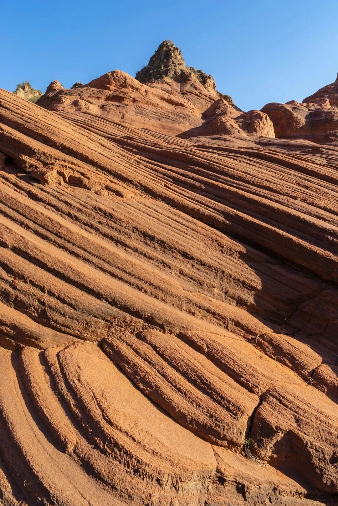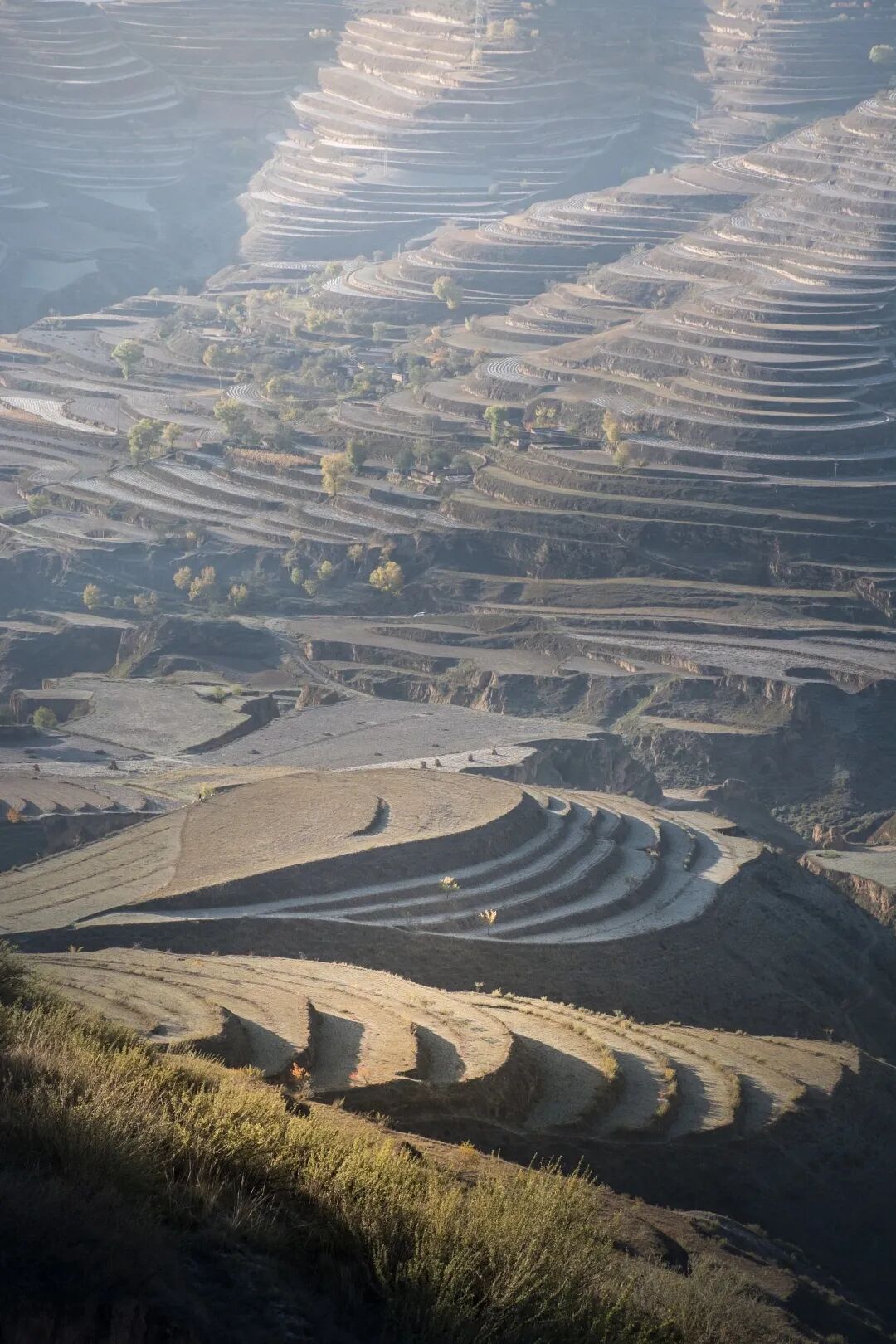 而黄土高原上的梯田与南方稻作梯田那种水汽盈盈的印象,完全不像,它们十分壮观,无遮无拦,仿佛地质年代无数次海侵留下的标记,层层叠叠,直上山巅。