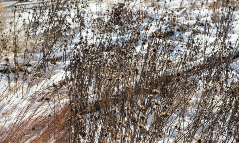 冬季枯萎的马鞭草和紫花针茅在白雪映衬下形成鲜明的轮廓,在阳光下的剪影仍是种别样的枯叶之美。