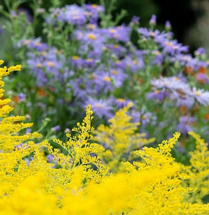 八月的“金摩萨”加拿大一枝黄花(Solidago 'Goldenmosa')和“暮色”大叶紫菀(Aster ‘Twillight')