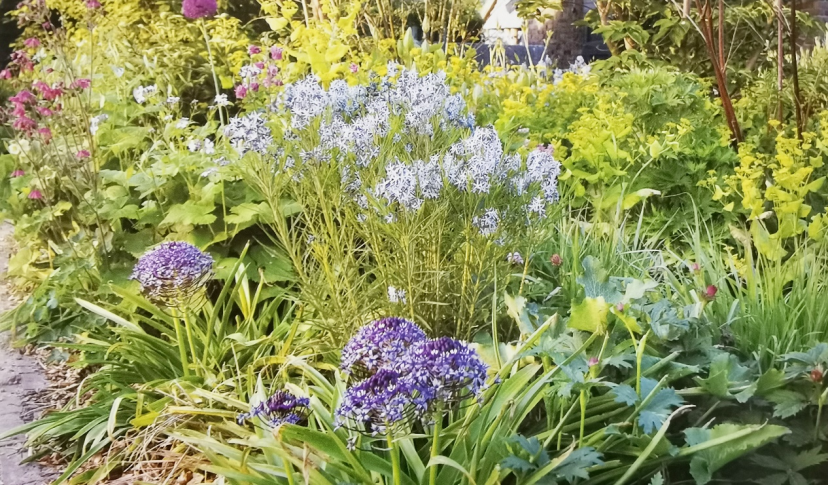 春夏交替之际,紫色的地中海蓝钟花(Scilla peruviana),及后方蓝色的胡氏水甘草(Amsonia hubrichtii)与黄色的穿叶芹(Smyrnium perfoliatum)形成了鲜明的撞色层次。