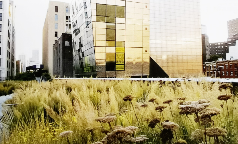 纽约高线公园位于纽约曼哈顿西侧,是一个由废弃的高架铁路改造的线型空中花园。高架沿线的园艺搭配就是由Piet Oudolf和James Corner合作设计的。Piet把原本的废弃铁路作为设计灵感,在改造时刻意保留了铁轨原有的碎石、铁轨等带有粗糙感的元素,利用了长得很高的草类、多年生植物和灌木,强调整个景观的结构、质地、形式,最终呈现出如同从枕木与铁轨间自然生长出来一样的景观,一派“野草丛生”的感觉。同时,其植物图景随四季不断变换,轨道中的野花和灌木丛也在不同季节生长,不会使景象变得枯燥。