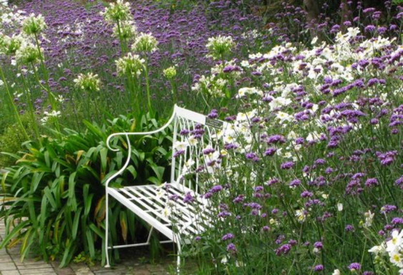 夏季的白色百子莲(Agapanthus africanus Albus)和谐地映衬了柳叶马鞭草(Verbena bonariensis)偏中性的紫色。