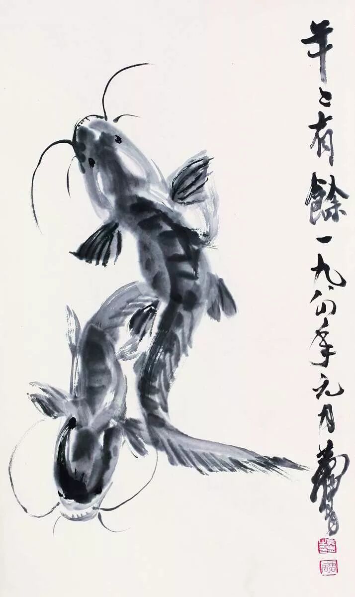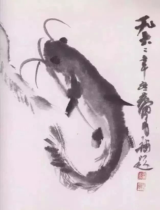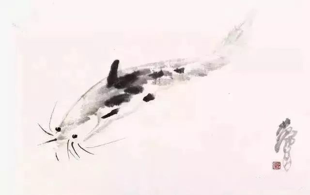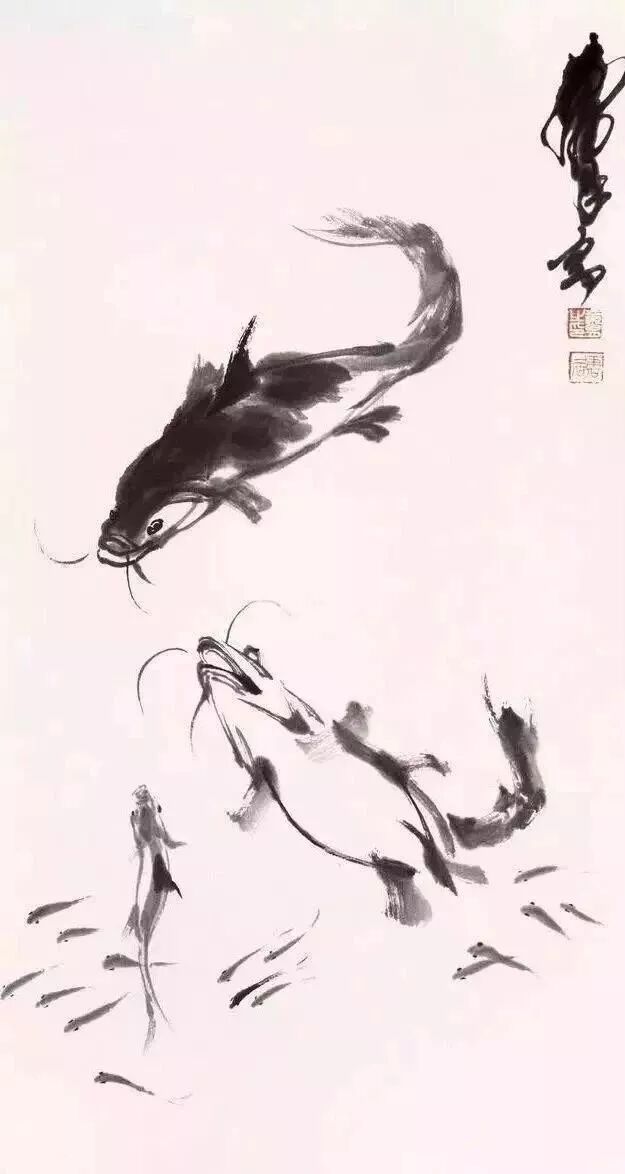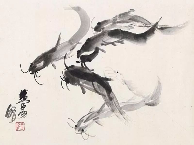 黄胄画鱼,寥寥几笔,墨韵淋漓,仿佛能看见它在水里畅游腾跃,追逐嬉戏、悠然自得的样子,非常鲜活!