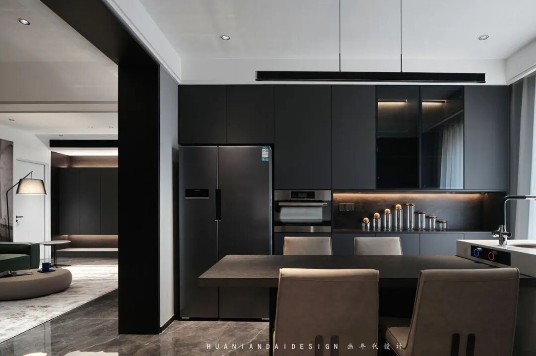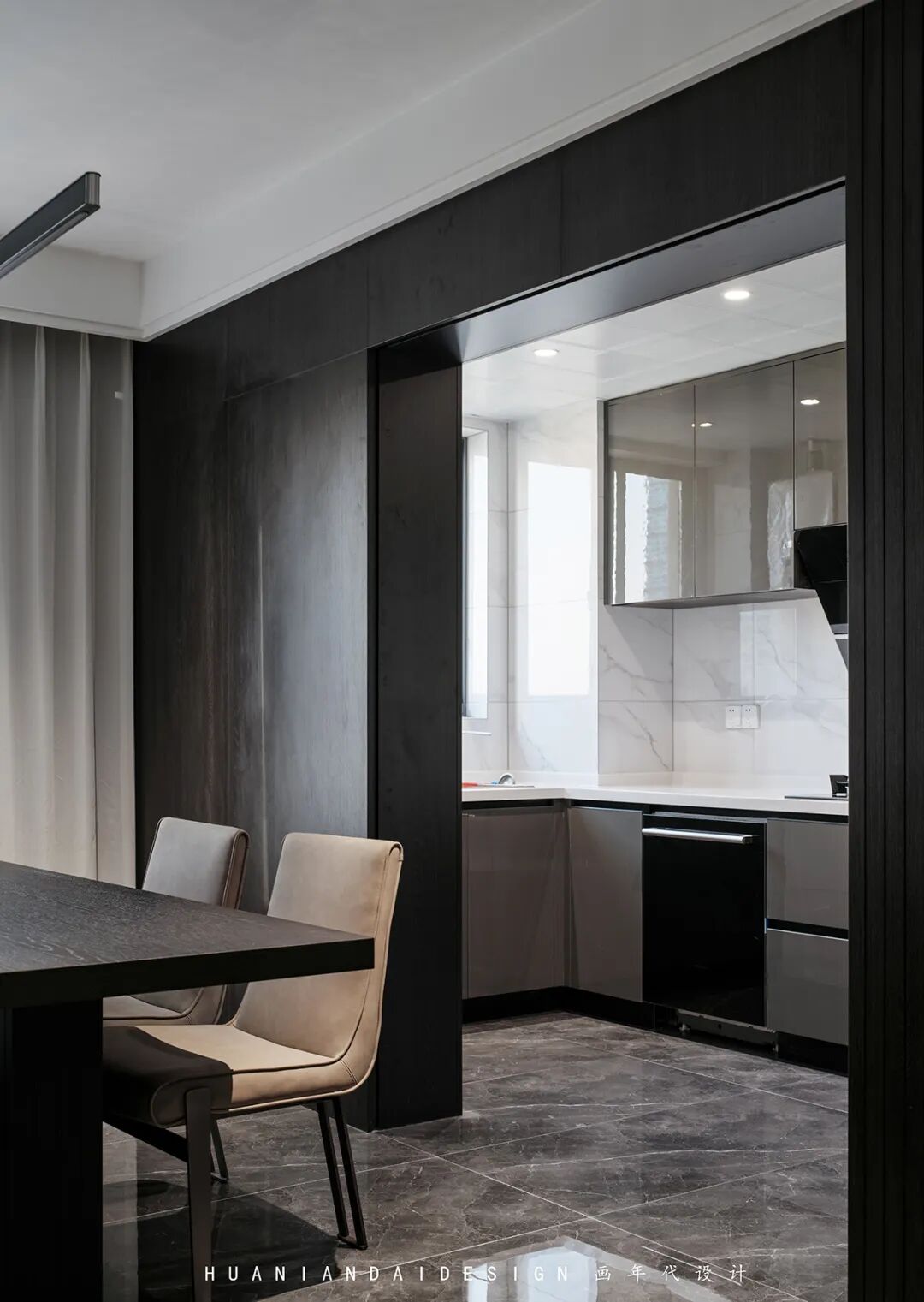 餐厅配备了水吧台和烘焙区,使功能更加全面。简单的线性灯,让看起来元素颇多的空间利落许多,柜子里的氛围灯更让空间气氛趋近于浪漫的无限值。