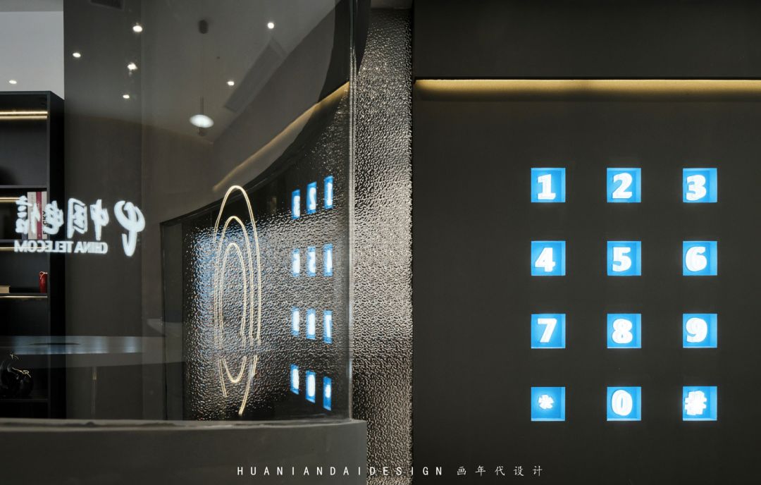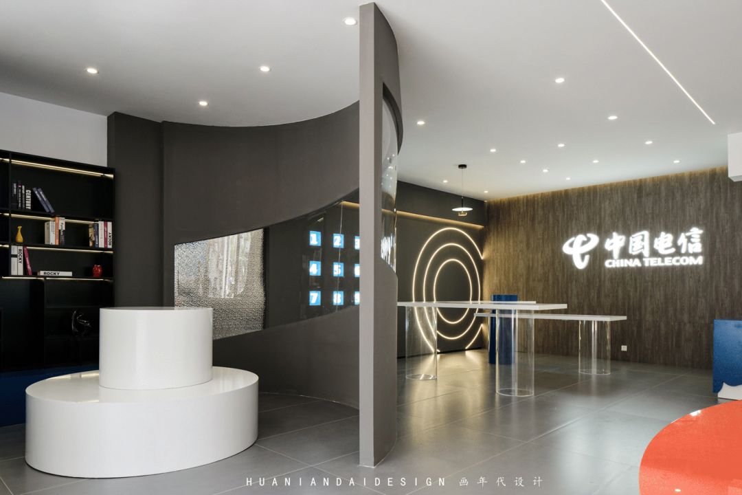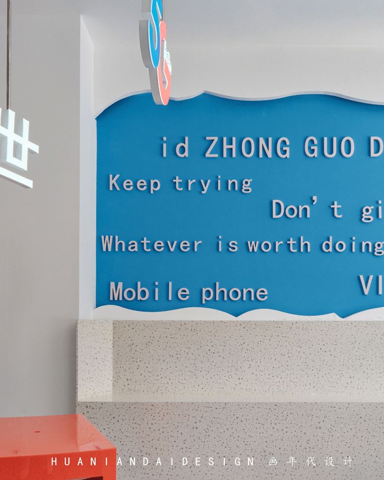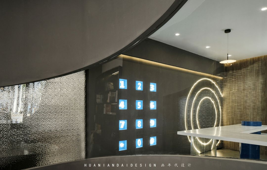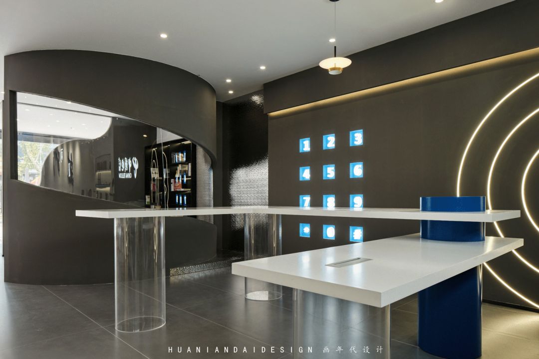 蓝色的造型点缀在白色的受理台上,白色的立方体被蓝色造型缓缓流下,近是蓝天白云,远则星辰大海。