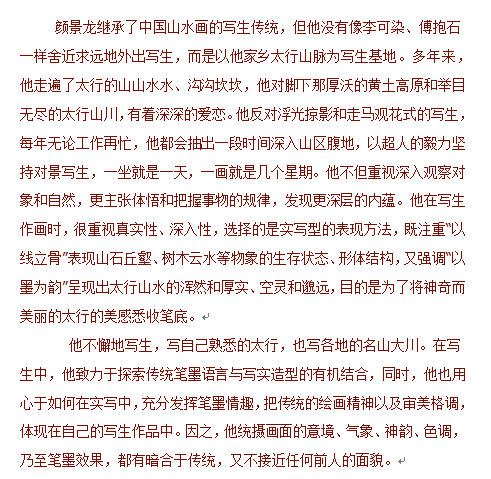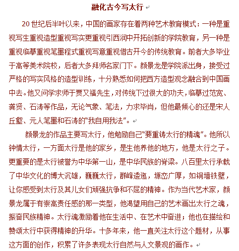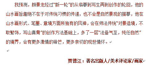 颜景龙,1955年生于河北省馆陶县,毕业于河北师范大学美术系,结业于中国艺术研究院研究生院第四届名家班,2016于中央美术学院贾又福山水画创作高级研究班进修。现为中国美术家协会会员、中国文艺志愿者协会会员、国家一级美术师、河北省第五届美术家协会副主席、中央文史研究馆书画院研究员、河北省文史研究馆馆员、享受政府特殊津贴、李可染画院研究员、河北省中国画学会副会长、河北美术学院教授、中国长城书画院理事、西藏自治区雪域书画艺术研究院理事。