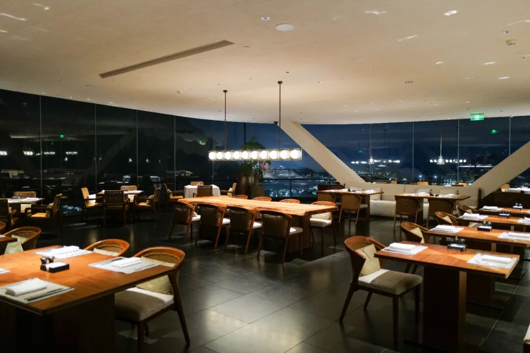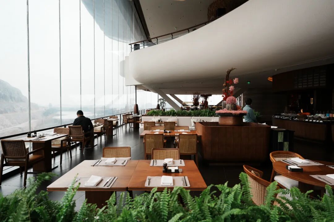 全日制餐厅「明月」有着挑空两层的舒畅空间,大堂层的优美栏杆和前台接待处的蚕茧造型装置,都成了餐厅的空间装点,加上绵延落地玻璃的守护,颇具香港丽晶的气韵,只是窗外景致由海景变为了更独具一格、磅礴感有过之而无不及的崖壁景观。