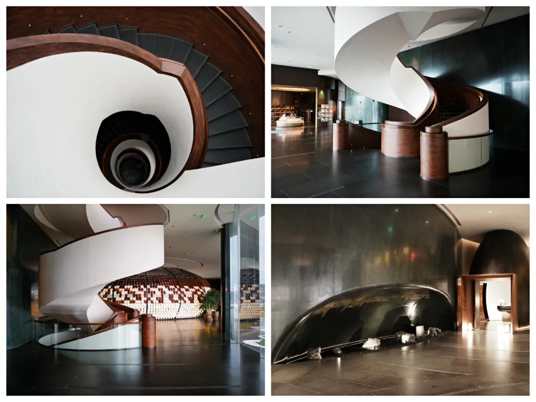 ▲ 大堂延展处还运用曲面墙、蛋形门、螺旋楼梯等反直线元素,甚至地砖都依照环形铺法铺就,增进空间的友好感和柔和感。