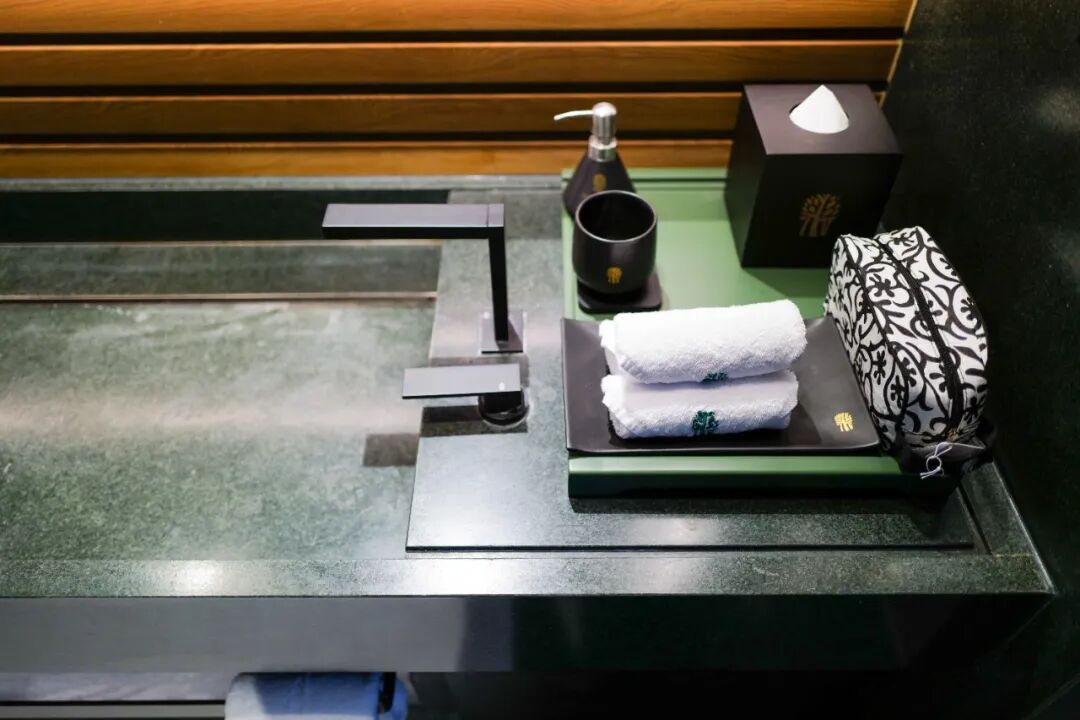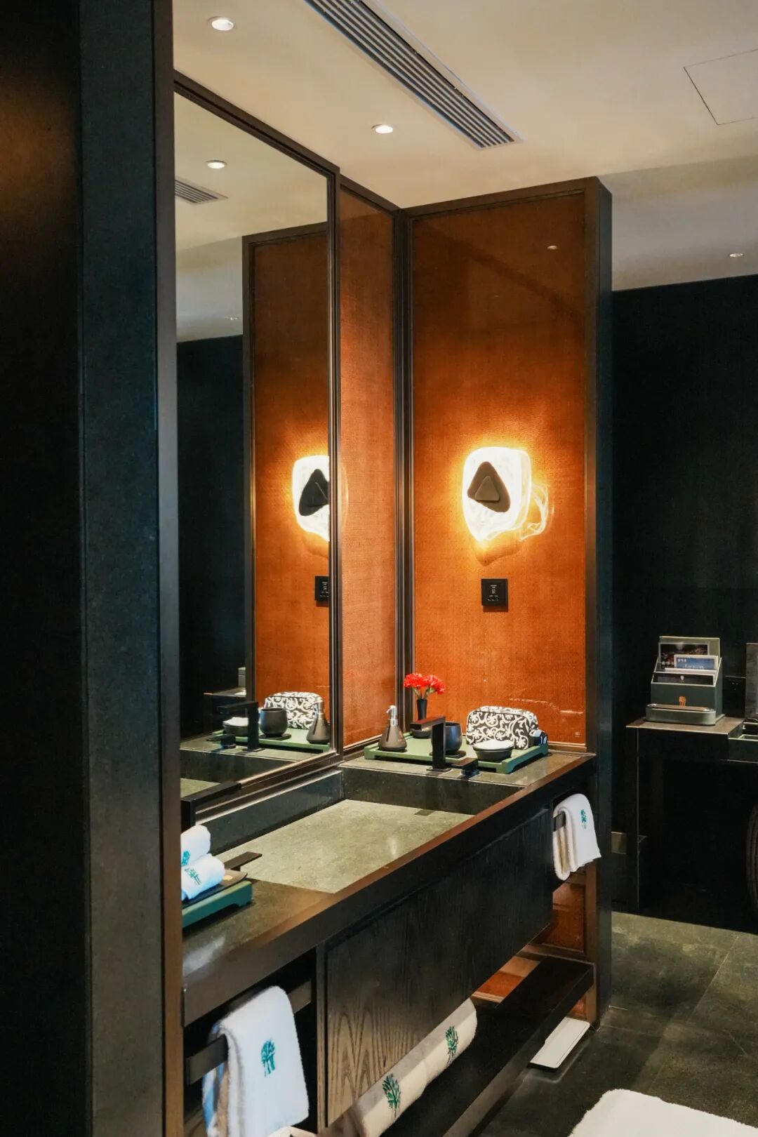 2. 石砌水台 洗手盆溅水大概是很多酒店客房最令人诟病的顽症之一,园博园悦榕庄把洗手间和浴室的盥洗盆,都做成了石砌式,台面和水池全然一体,水流会静静淌入池底的缝隙中,缓解了我这类上升处女座人士面对传统台盆溅水现象的无力感与糟心度,用超长水台代替双台盆的设计让人畅快。