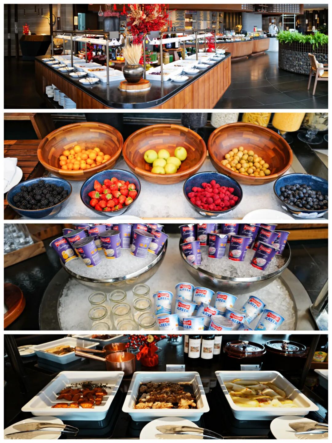早间时段就供应两款气泡酒,其中一款澳洲产Audariy甜红无酒精气泡酒,真是我这等上脸又好甜口又好气氛者的福音。水吧部分还包括畅饮的圣培露气泡水、普纳矿泉水、以及多种口味的进口酸奶。另外,自助冷热菜、水果(实现各种莓果自由)、和现做档口也都选品考究、出品上乘。