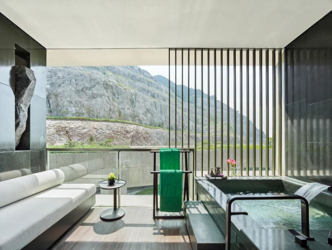 这组为矿谷带来新生的奢华酒店建筑,由中国建筑设计研究院的崔愷院士操刀,呈阶梯布局、曲线走向,仿佛矿谷崖壁的延伸、又小心处理着与崖壁的边界感,亦交融亦冲突。在理念前瞻(酒店界可持续、康养、扶植地方匠艺的先驱)但建筑物呈现向来低调柔和的悦榕庄酒店阵列中,显然是一间外形极具张力和未来感的产物,在致敬矿谷场景的同时,也点亮了矿谷乃至整个园博园园区,更似悦榕庄建筑理念的一次变革或进阶。且可以认作悦榕庄的2.0产物。
