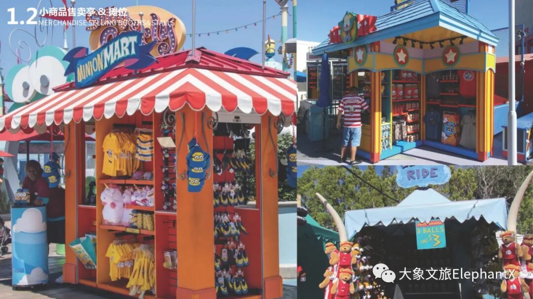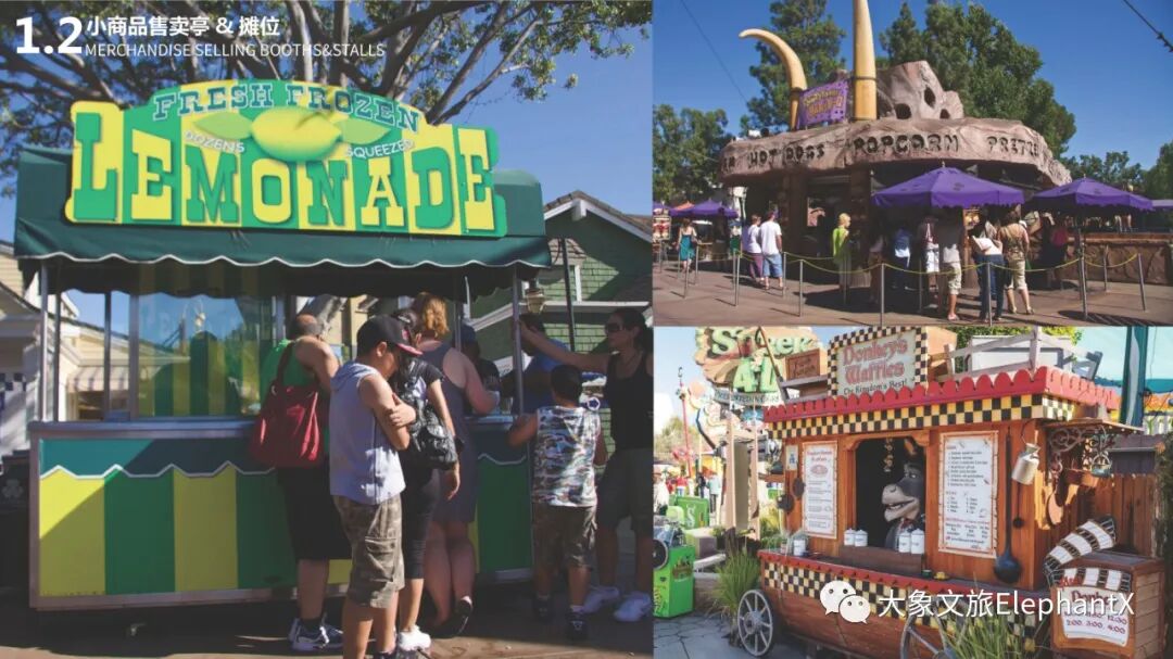 乐园里的售卖车&摊位是提供餐饮或者小商品售卖的服务设施,一般为临时构筑物,也有些以售卖车的形式出现,可灵活移动。这些售卖车&摊位一般可以分为两大类功能,一类是餐饮,另一类则是小商品售卖(画像、画脸谱、游戏等摊位包括在内)。