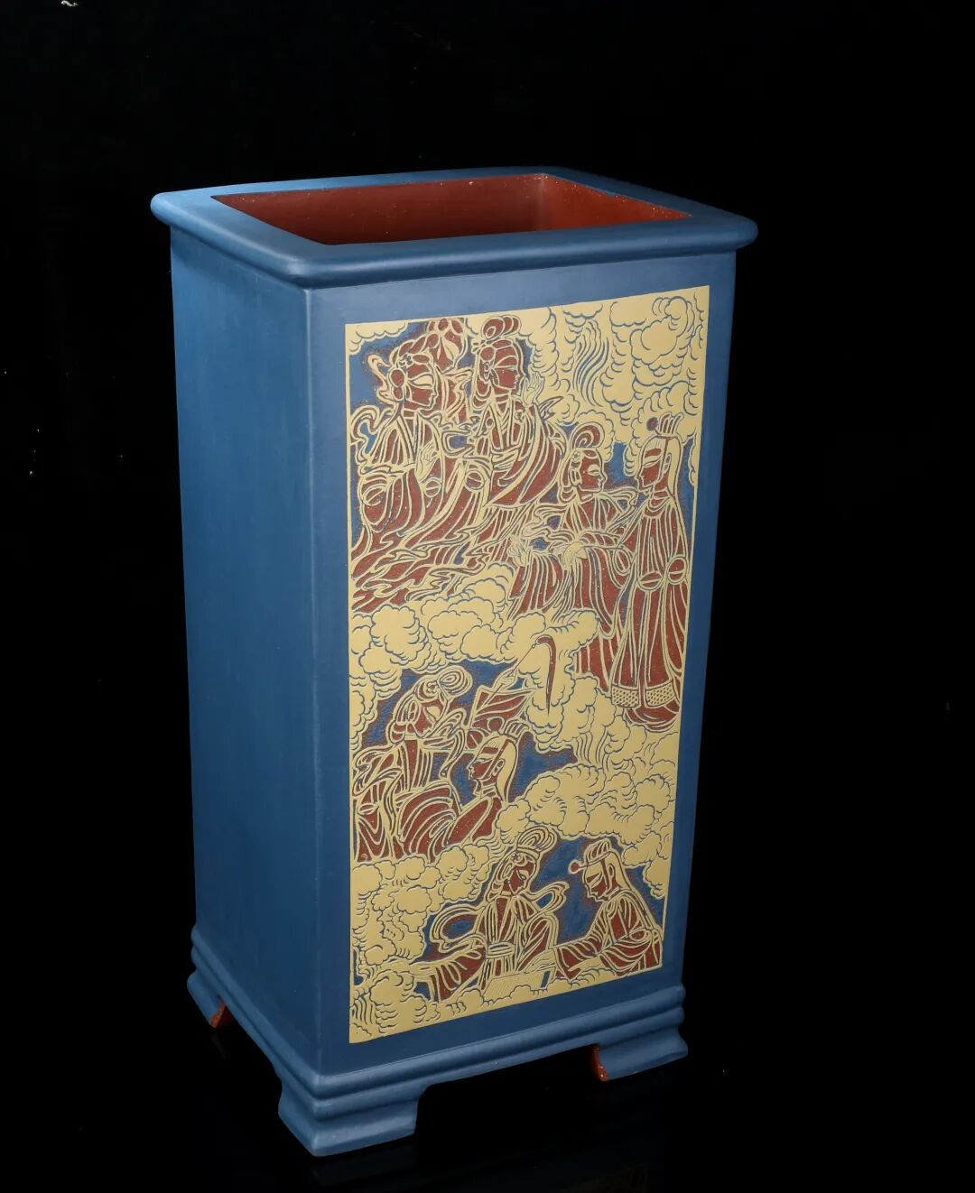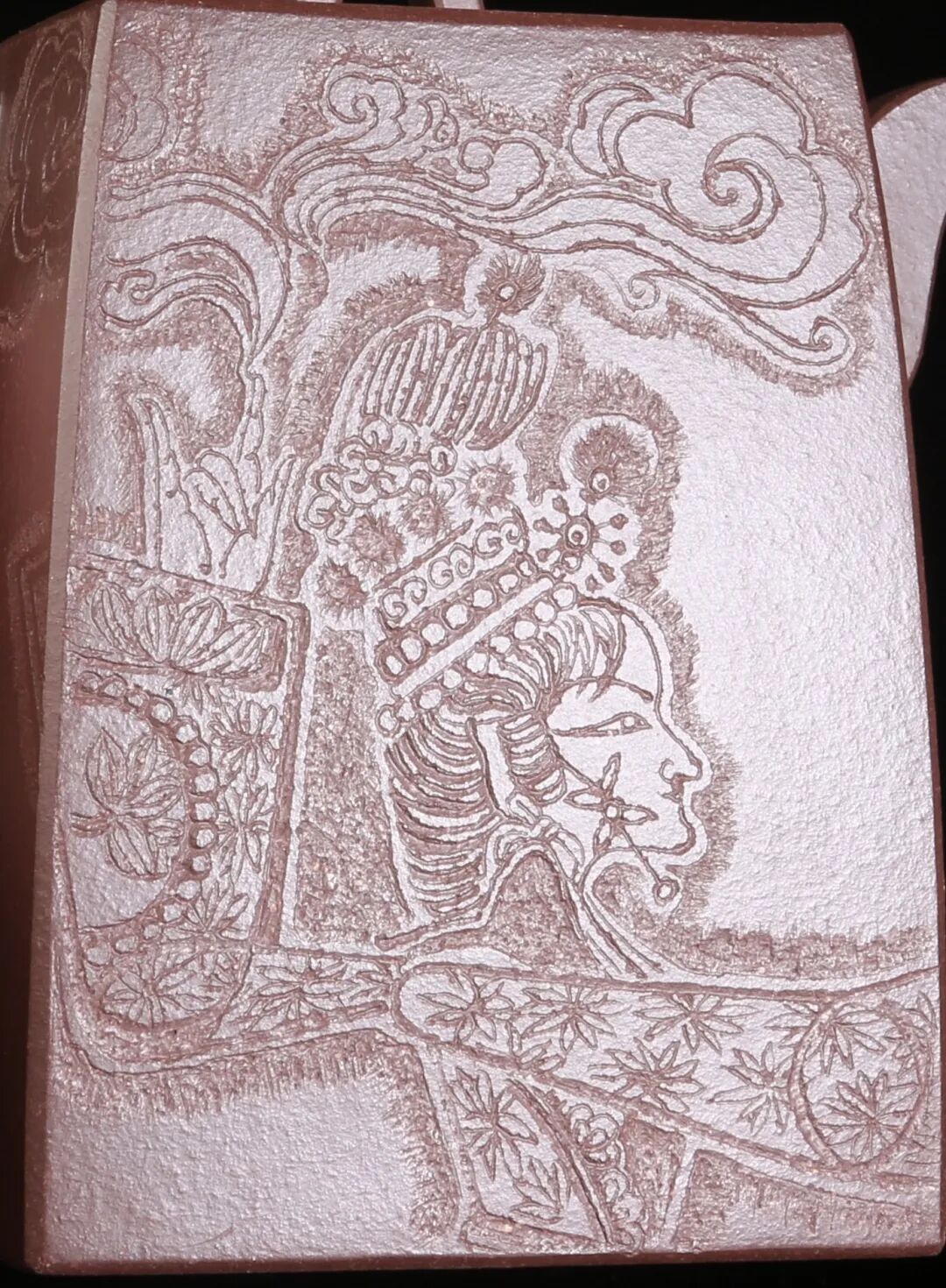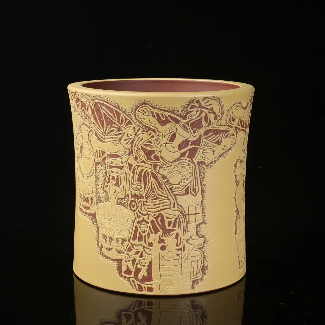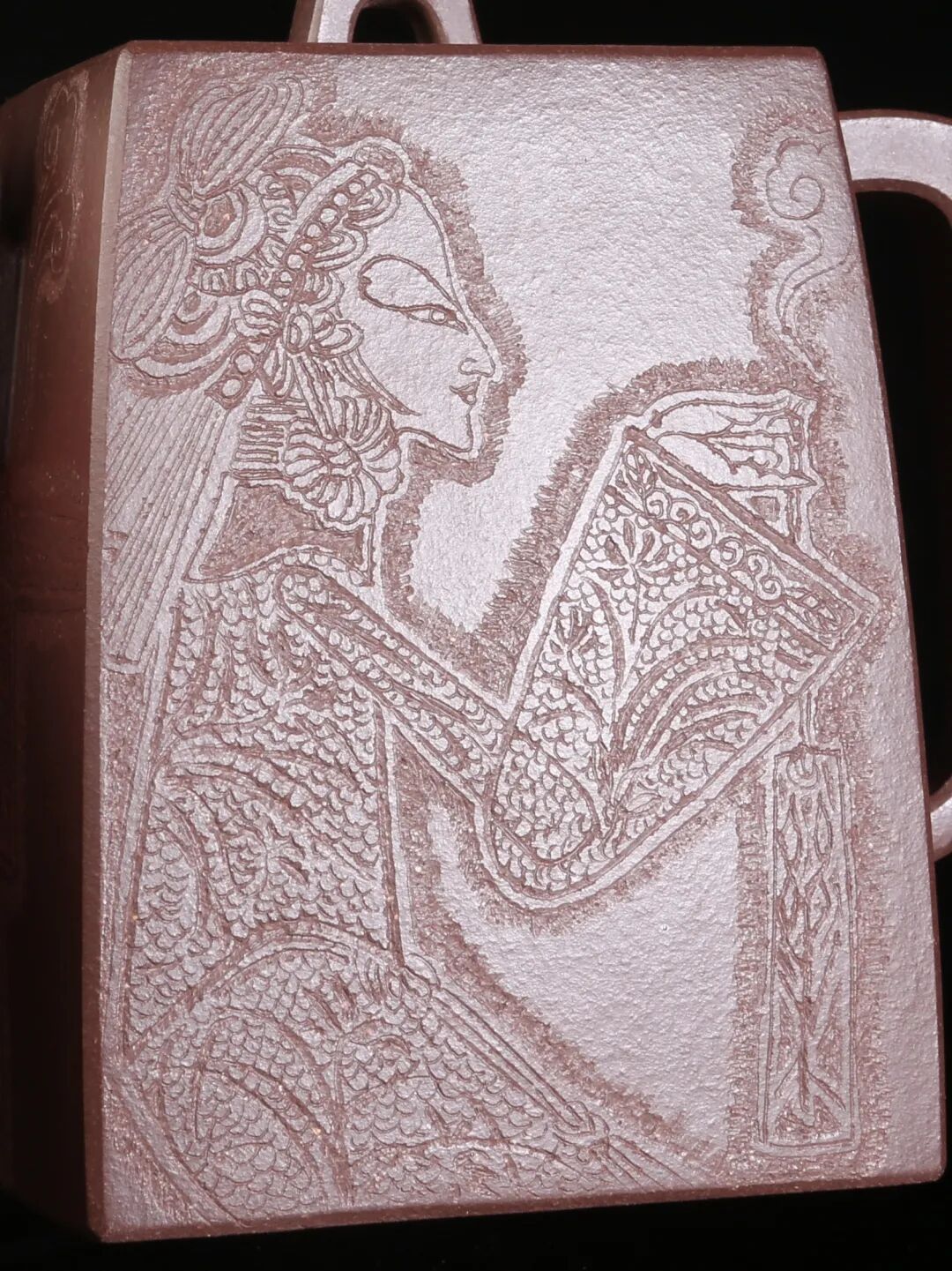 本科学习时期,老师常常给出令我费解的言说,譬如线条的厚度等等,疑惑几乎每天都在堆积,然而对于现在的我来说,真好!我时常会感激那时的自己,堆积的困惑给现在的我留下了太多探寻的方向,像是草蛇灰线,伏脉千里。疑虑的产生正是在启迪一个未被感知的答案,要走下去,给出解答。通过紫砂的创作,我对线条厚度的表达感受颇深,紫砂这一材料成为一把钥匙,在一件接一件的皮影系列的刻砂创作中,通过刻刀在紫砂器上的运行,线条的表达更加丰富,厚度也得到了相应的呈现。“影”这一概念的介入,也使我在边缘线的刻法上进行了很多思考和拓展,运用不同刻法的叠加、对比、呼应等增加层次,从而变换线条厚度。