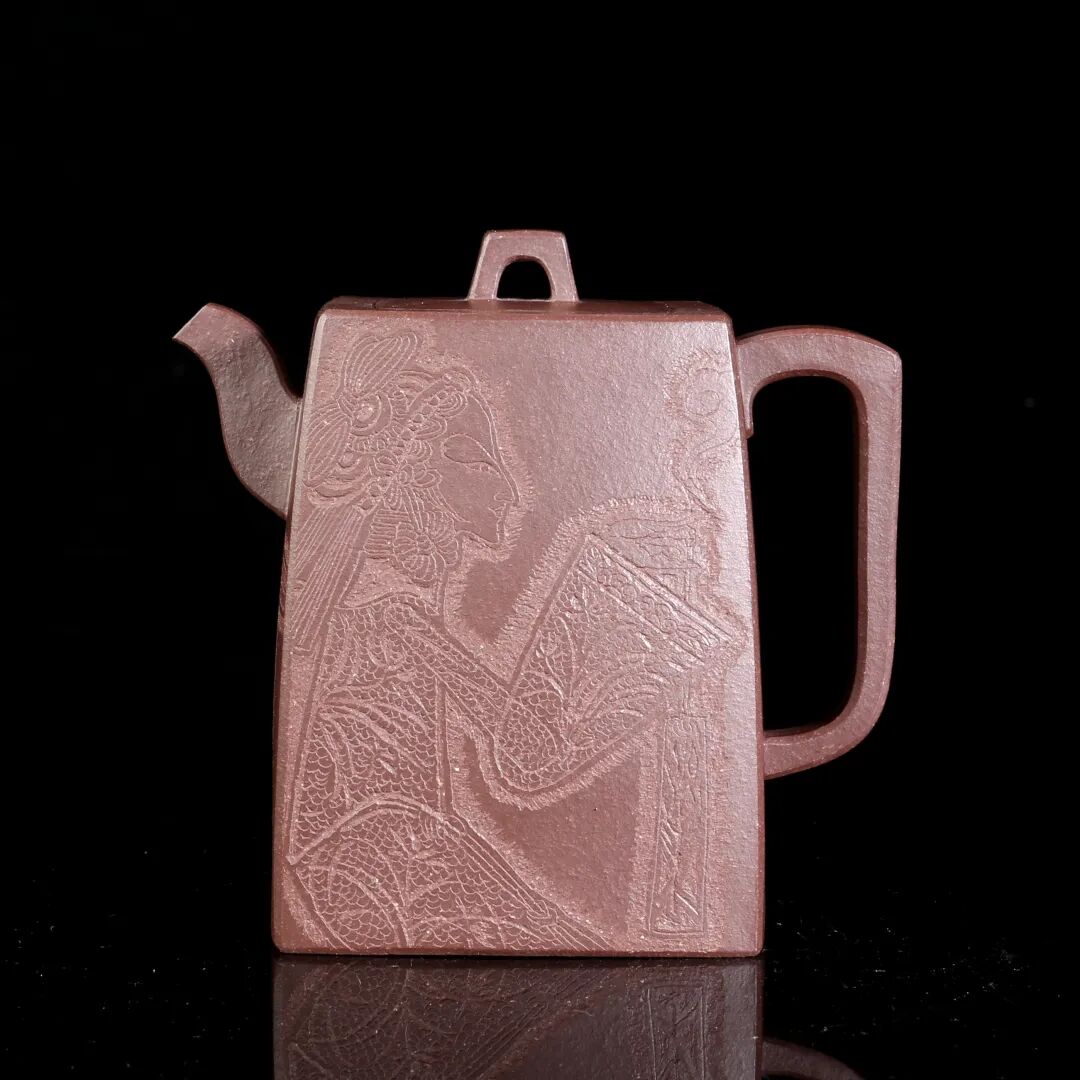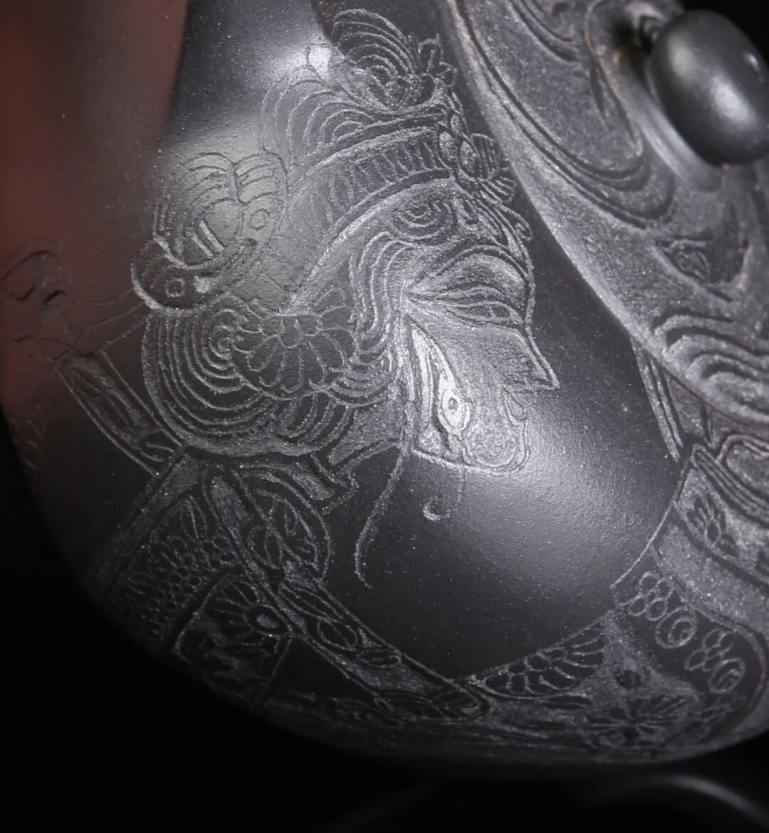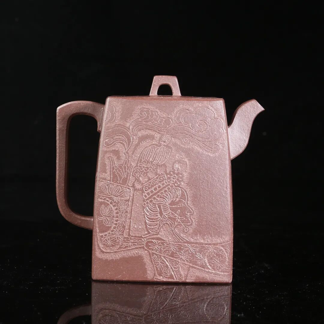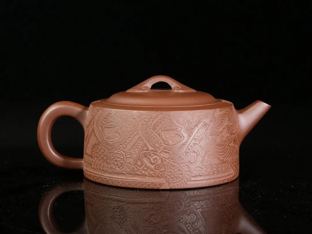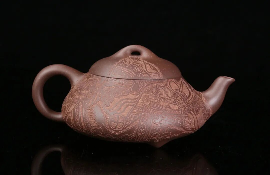 皮影的纹饰具有很强的装饰性,在刻砂的创作中与紫砂器物所具有的观赏性相契合。装饰性与观赏性是我在紫砂创作中的第一个关联点。我以皮影的纹饰作为初期刻砂的重点,通过繁复的皮影纹饰的雕琢,浅尝不同皮影人物精彩的造型方式和配景的繁丽,将皮影制作上的镂空技艺与刻砂的运刀技法相结合,契合紫砂器物本身的形制变化,表现的是题材本身繁简相宜、虚实相生的线条韵势之美,将皮影与紫砂构建成为一个形式上的艺术整体。