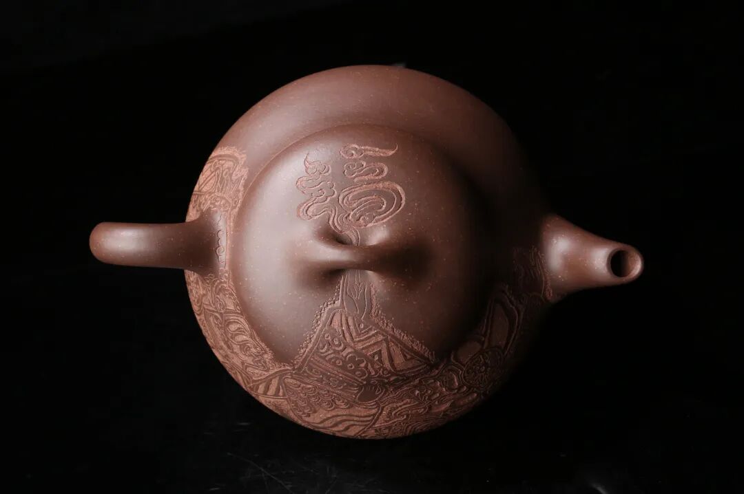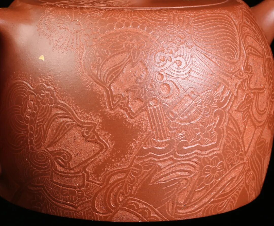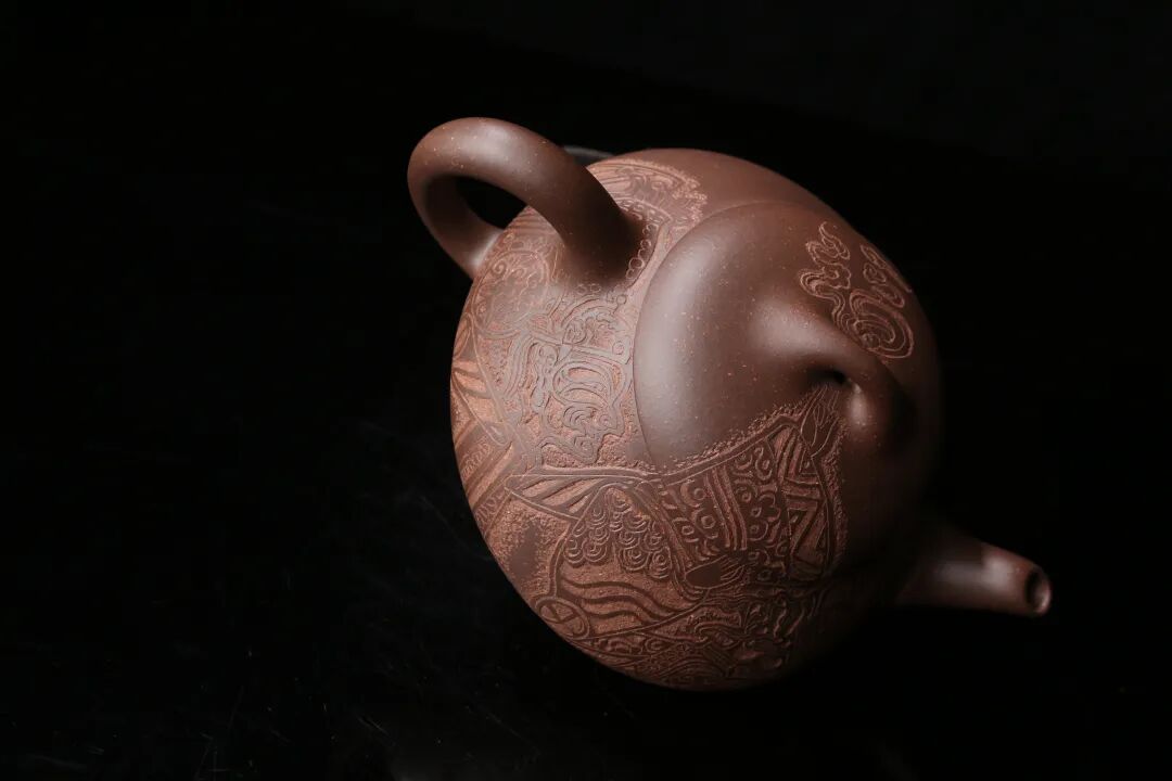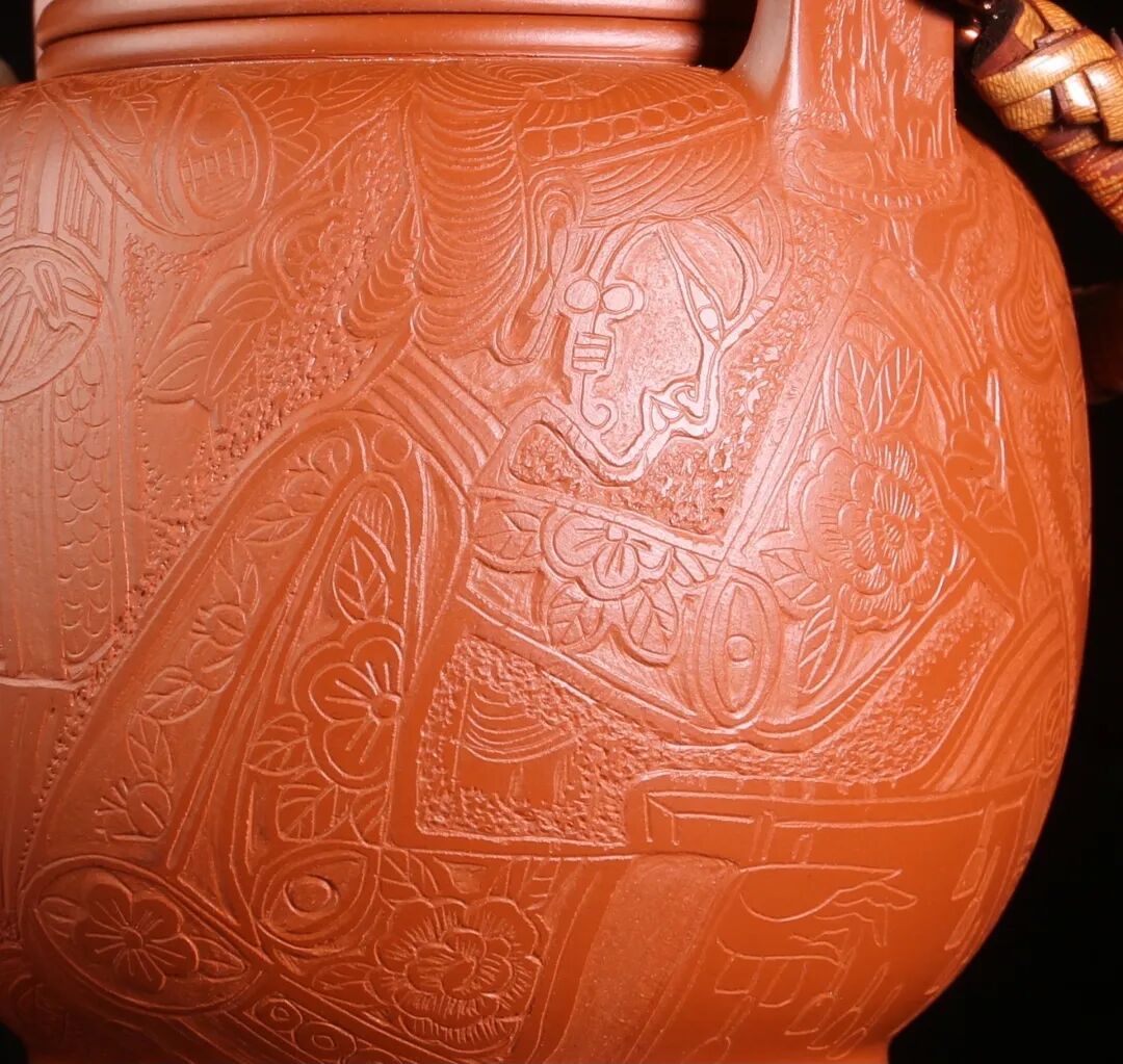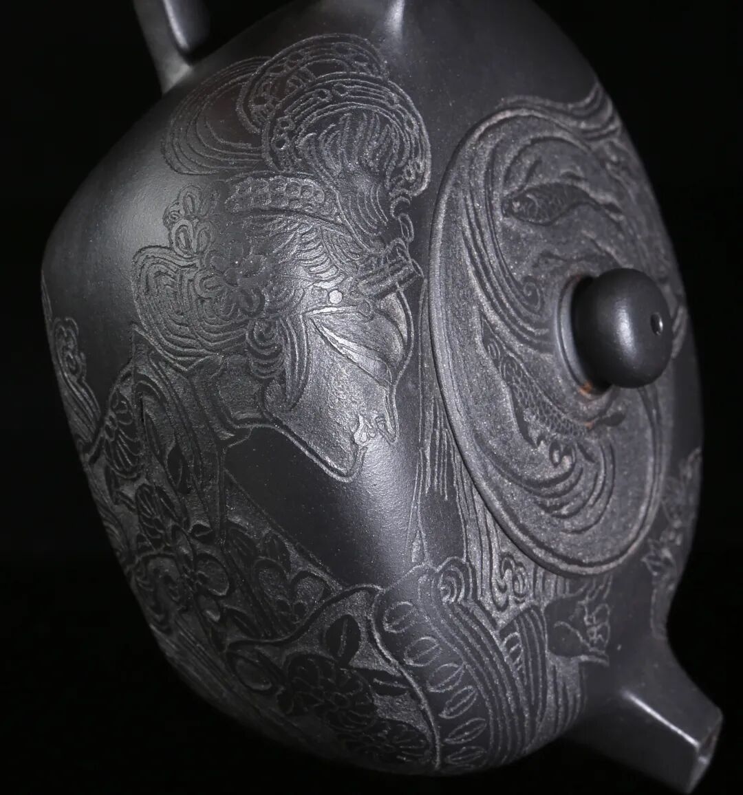 皮影的纹饰具有很强的装饰性,在刻砂的创作中与紫砂器物所具有的观赏性相契合。装饰性与观赏性是我在紫砂创作中的第一个关联点。我以皮影的纹饰作为初期刻砂的重点,通过繁复的皮影纹饰的雕琢,浅尝不同皮影人物精彩的造型方式和配景的繁丽,将皮影制作上的镂空技艺与刻砂的运刀技法相结合,契合紫砂器物本身的形制变化,表现的是题材本身繁简相宜、虚实相生的线条韵势之美,将皮影与紫砂构建成为一个形式上的艺术整体。