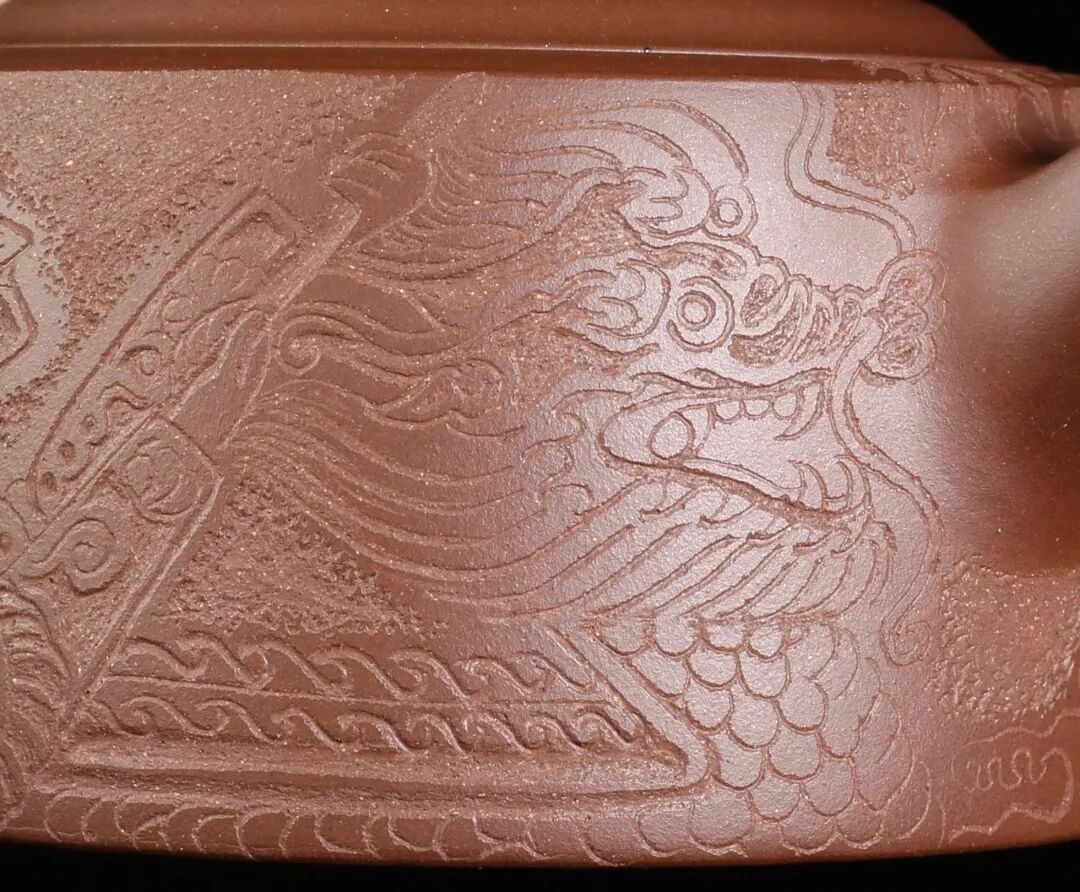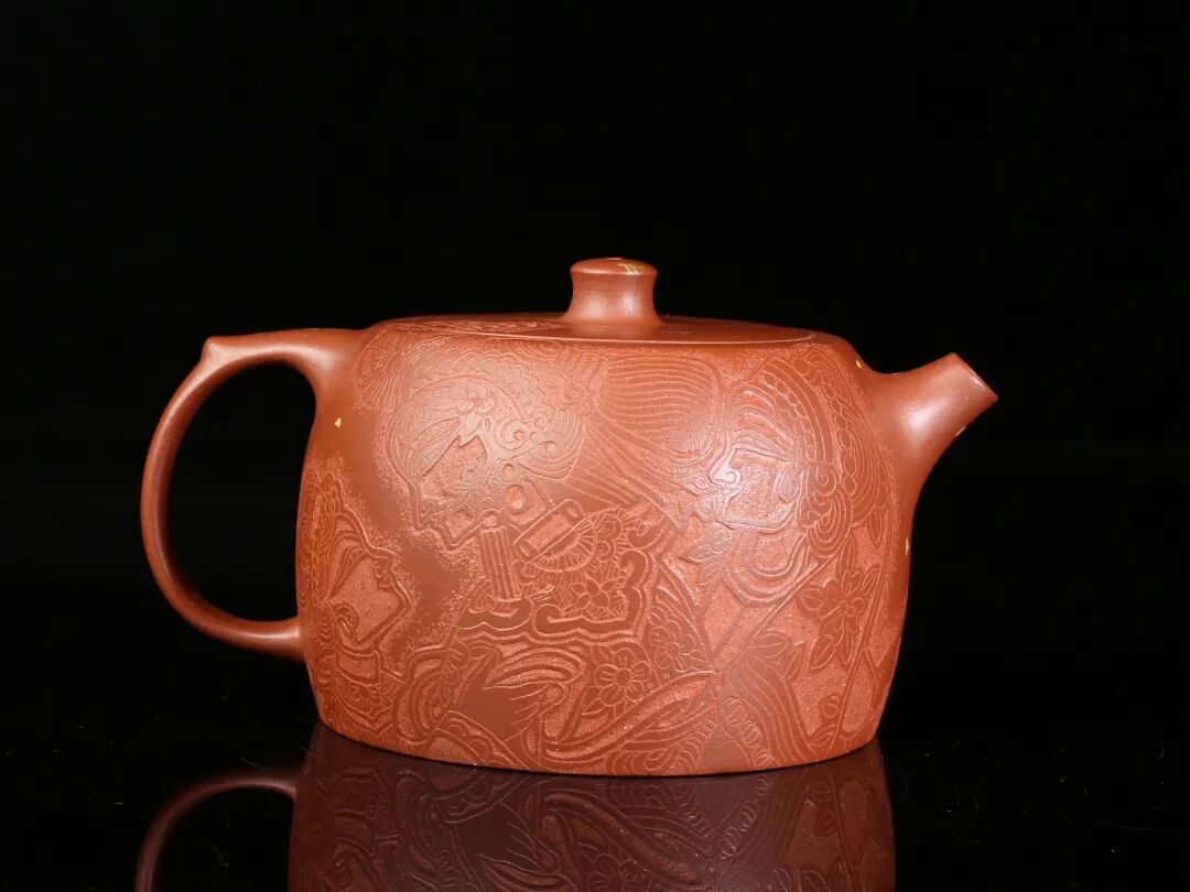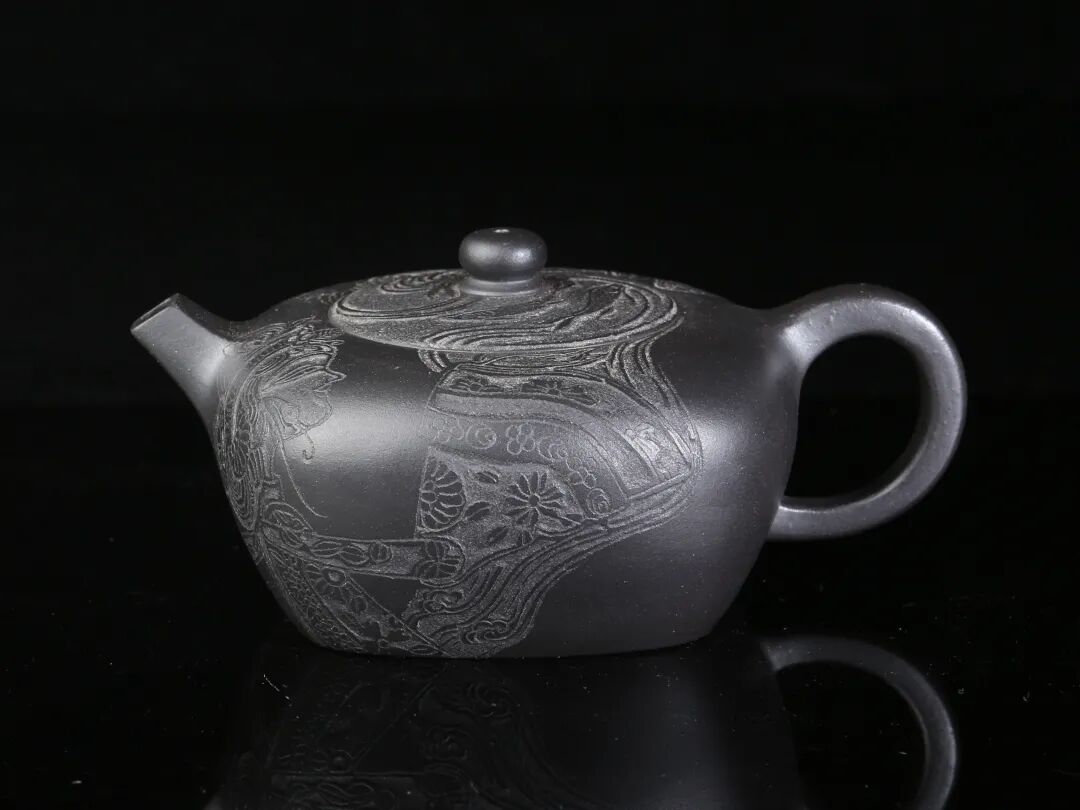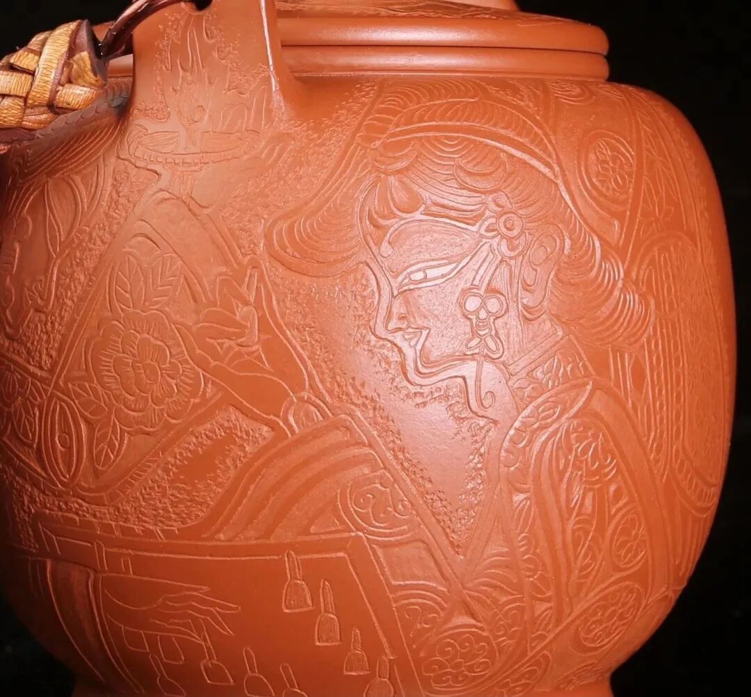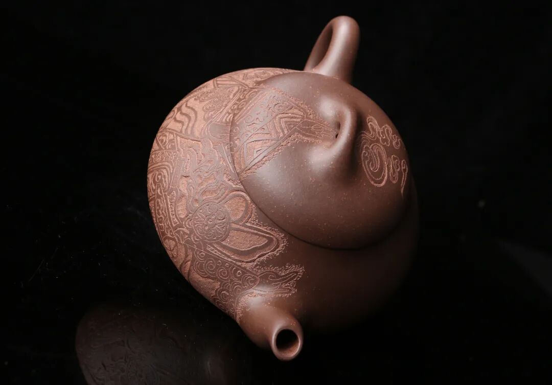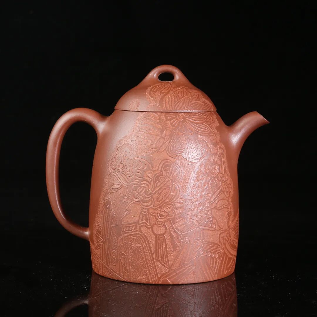 皮影的纹饰具有很强的装饰性,在刻砂的创作中与紫砂器物所具有的观赏性相契合。装饰性与观赏性是我在紫砂创作中的第一个关联点。我以皮影的纹饰作为初期刻砂的重点,通过繁复的皮影纹饰的雕琢,浅尝不同皮影人物精彩的造型方式和配景的繁丽,将皮影制作上的镂空技艺与刻砂的运刀技法相结合,契合紫砂器物本身的形制变化,表现的是题材本身繁简相宜、虚实相生的线条韵势之美,将皮影与紫砂构建成为一个形式上的艺术整体。