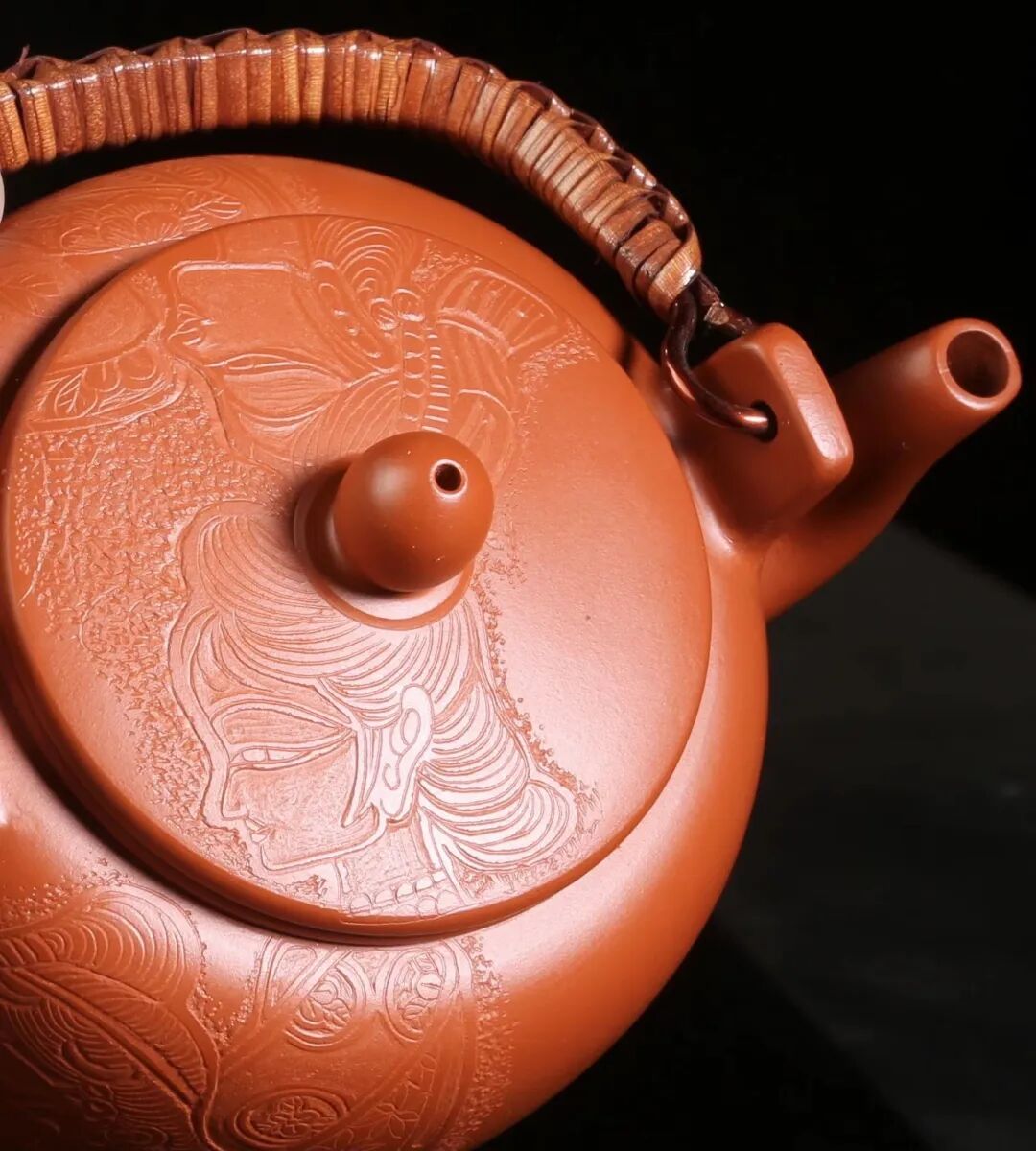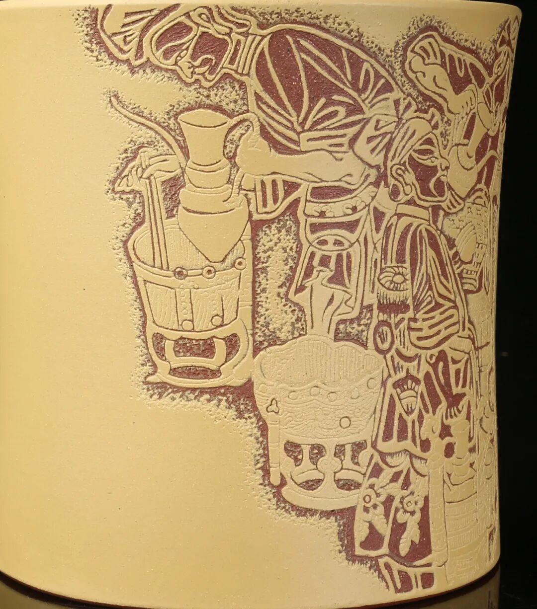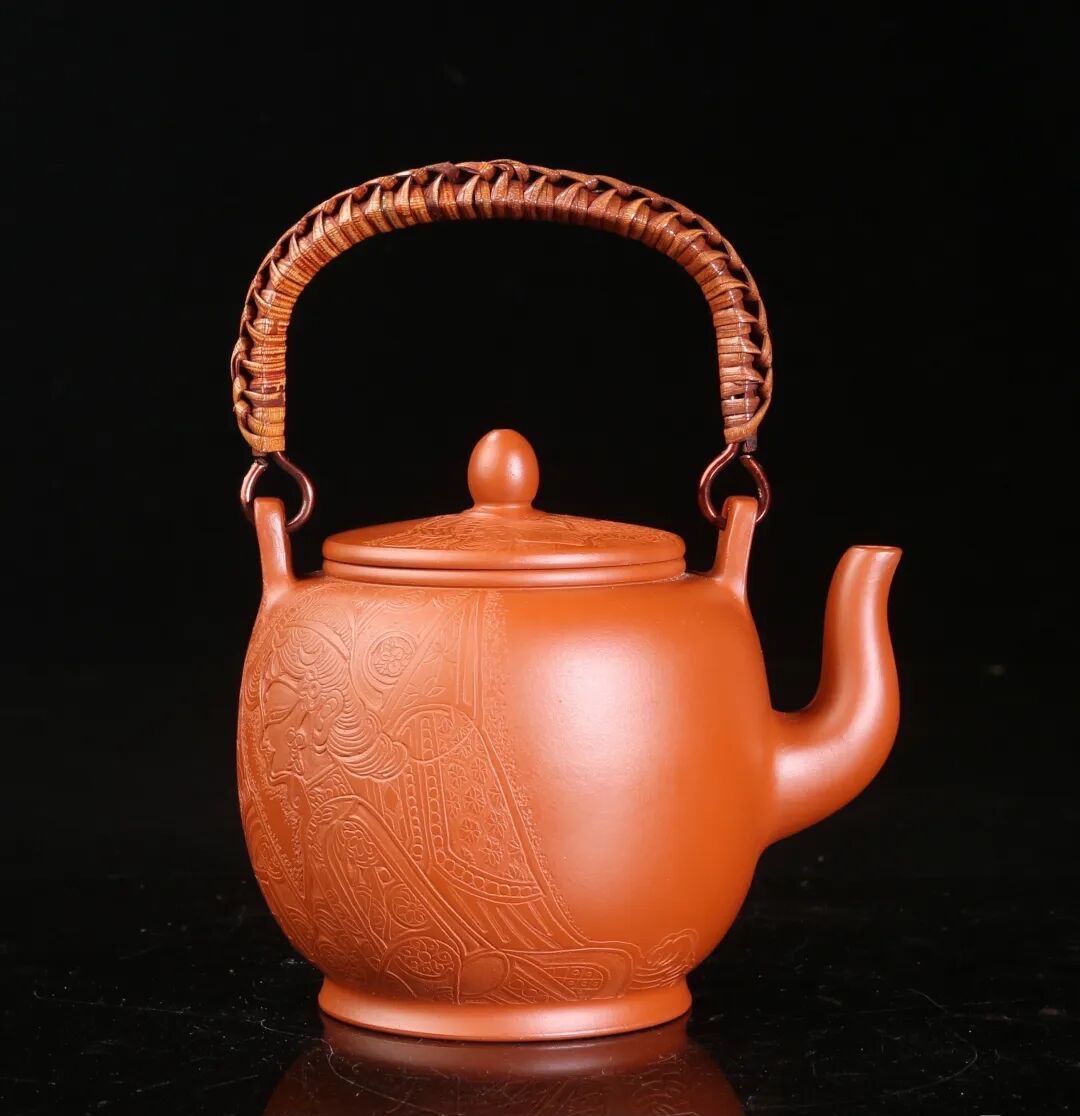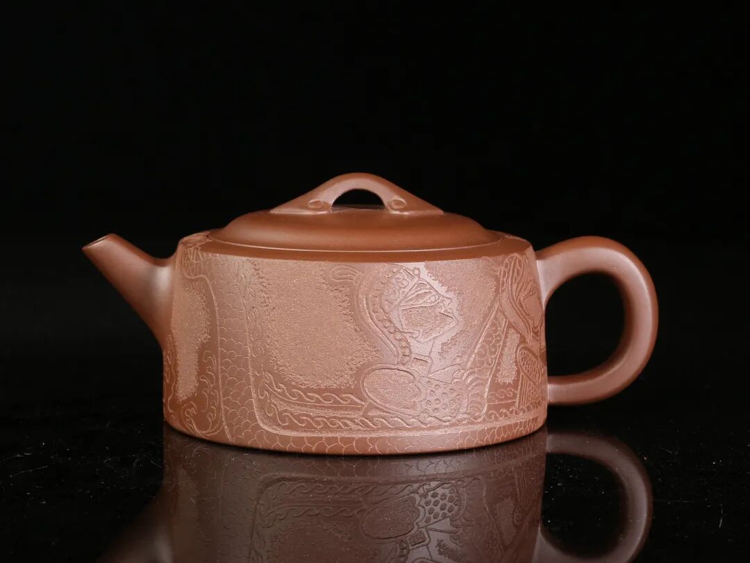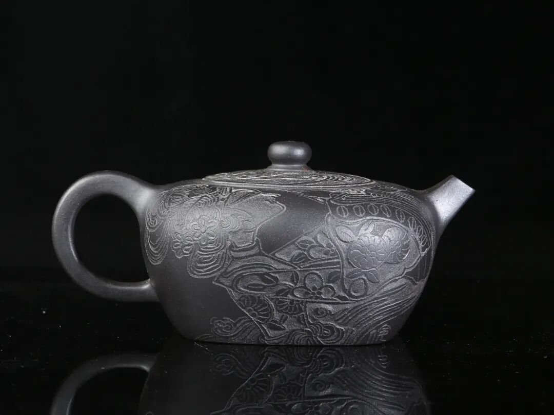 皮影的纹饰具有很强的装饰性,在刻砂的创作中与紫砂器物所具有的观赏性相契合。装饰性与观赏性是我在紫砂创作中的第一个关联点。我以皮影的纹饰作为初期刻砂的重点,通过繁复的皮影纹饰的雕琢,浅尝不同皮影人物精彩的造型方式和配景的繁丽,将皮影制作上的镂空技艺与刻砂的运刀技法相结合,契合紫砂器物本身的形制变化,表现的是题材本身繁简相宜、虚实相生的线条韵势之美,将皮影与紫砂构建成为一个形式上的艺术整体。