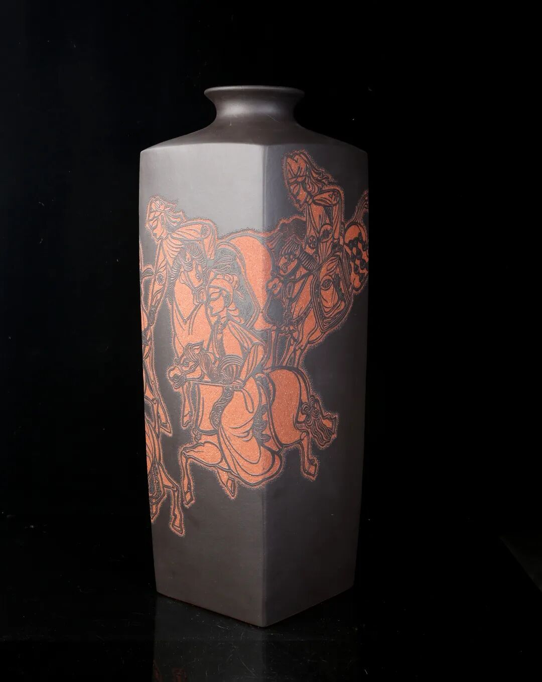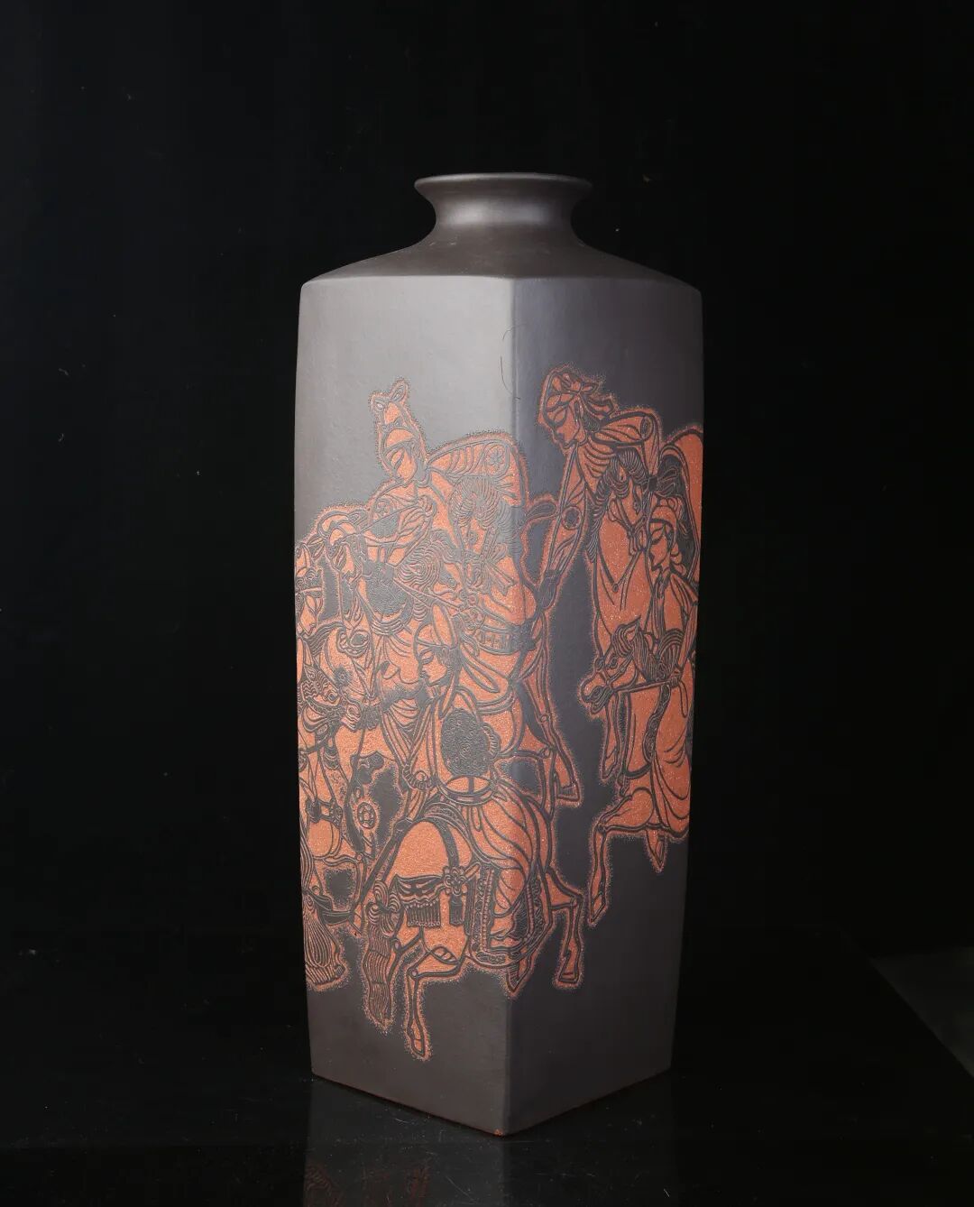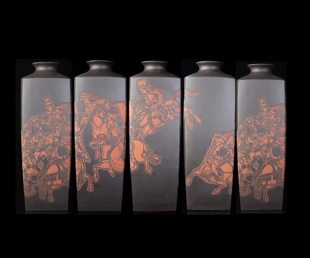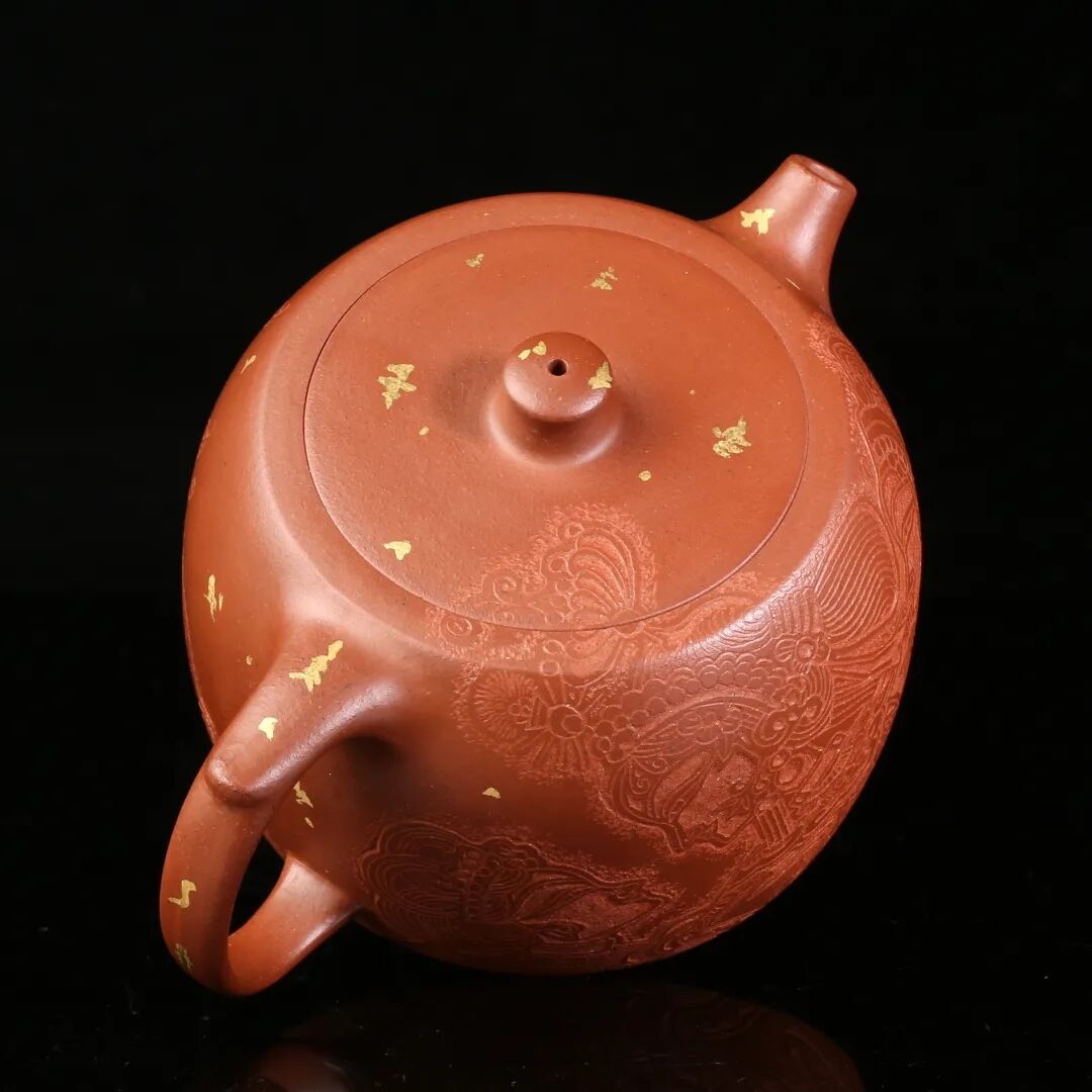 皮影的纹饰具有很强的装饰性,在刻砂的创作中与紫砂器物所具有的观赏性相契合。装饰性与观赏性是我在紫砂创作中的第一个关联点。我以皮影的纹饰作为初期刻砂的重点,通过繁复的皮影纹饰的雕琢,浅尝不同皮影人物精彩的造型方式和配景的繁丽,将皮影制作上的镂空技艺与刻砂的运刀技法相结合,契合紫砂器物本身的形制变化,表现的是题材本身繁简相宜、虚实相生的线条韵势之美,将皮影与紫砂构建成为一个形式上的艺术整体。