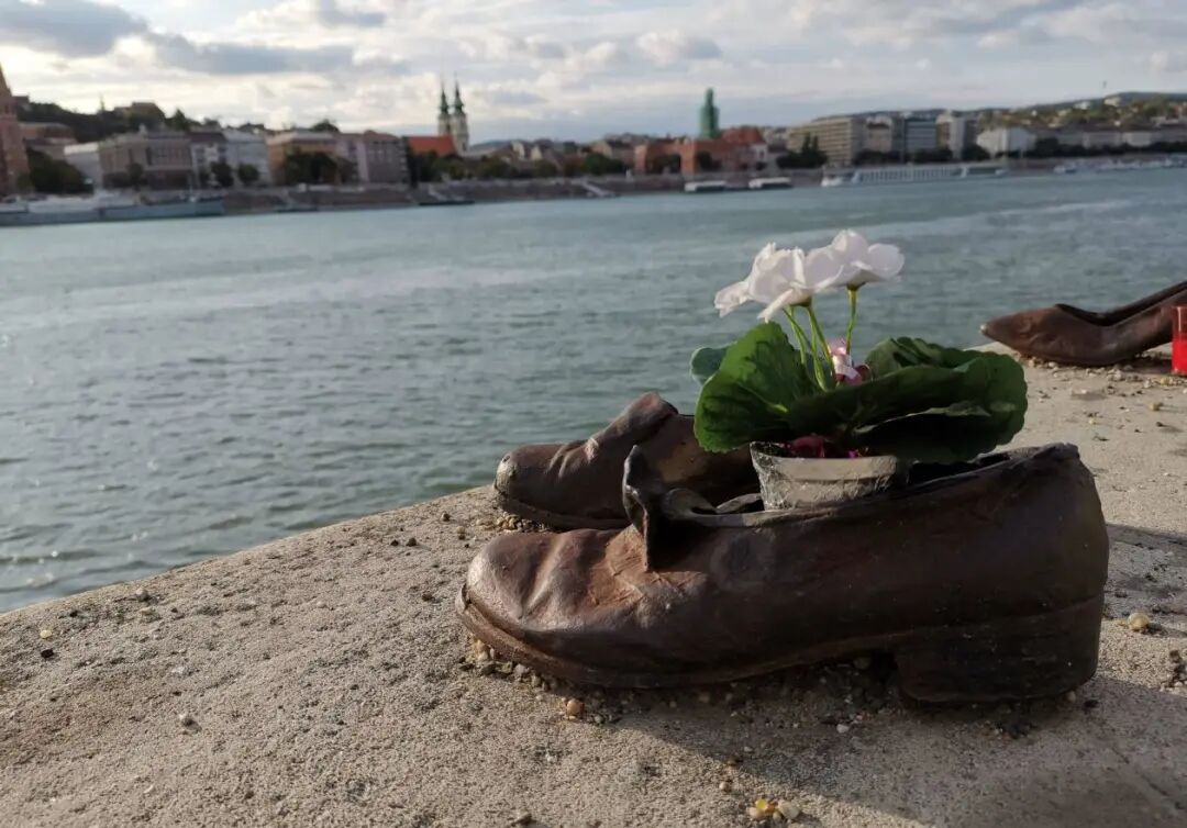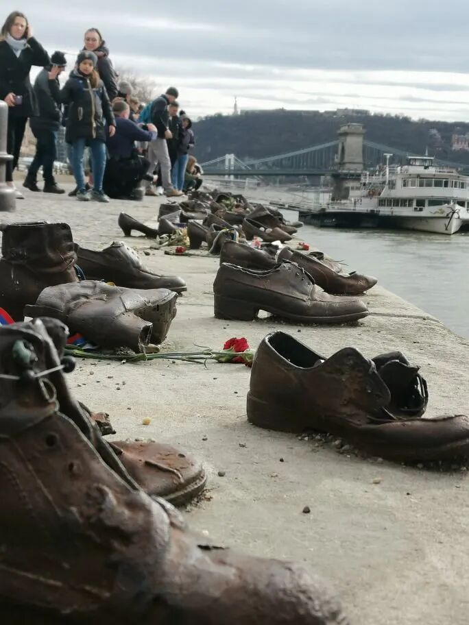 在匈牙利首都布达佩斯链子桥和马格丽特桥之间的多瑙河堤岸上,一双双各式各样的铁鞋散放在岸边,绵延20多米长,其间有许多蜡烛瓶、鲜花、已经干枯的花枝放置在鞋子之中。这是由匈牙利雕塑家鲍乌埃尔·久洛创作的纪念性艺术雕塑。作品由60双钢铁浇筑而成的鞋子组成,放置于多瑙河岸,用以纪念二战中当地被法西斯屠杀的无辜犹太民众。铁鞋雕塑落成后,每年4月16日,匈牙利的犹太人组织和反极右团体都会来这里举行纪念活动。现在,这里已成为布达佩斯一处著名的景点,前来的人们有的献上鲜花,有的点起蜡烛,还有的则是将一粒石子放在鞋边或鞋里面,以表达对逝者的纪念。