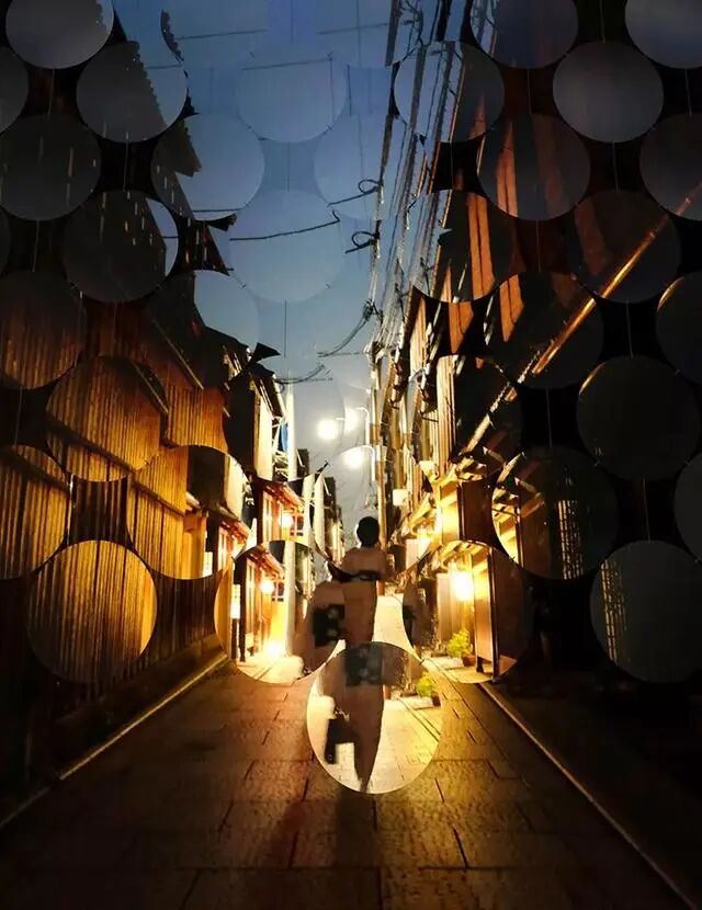 动力雕塑(Slow Lens)是法国装置艺术家Vincent Leroy在日本京都的项目,其安装在祈园的小巷里。装置中有机排列的圆镜像悬挂的放大镜一样,会不断地慢慢旋转镜片把周围的建筑和道路折射成模糊而有趣的碎片,一直盯着它看,你会产生一种恍惚感,分不清空间与时间的界限。到了晚上,灯光的碎片更加引人入胜,带有放大作用的镜片所折射出的光景似乎变得更加自由,流畅,脱离了现实世界的所有限制。 穿过它仿佛就是千与千寻中那光怪陆离的异世界。