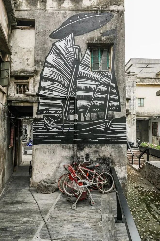 位于深圳的《沙井》作品是“时光漂流,沙井古墟新生”城市现场展作品。其以散落在村落不同位置的壁画方式呈现,回应过去、当下和明天。作者认为木刻与社会是紧密相连的关系,这就像迎头撞击的即兴写作。沙井村落里的老建筑有丰富耐看的肌理,对应火热的生活,就像时间留下的舞台;舞台是大家的,我们用自己的工作以表时空穿梭之曼妙。