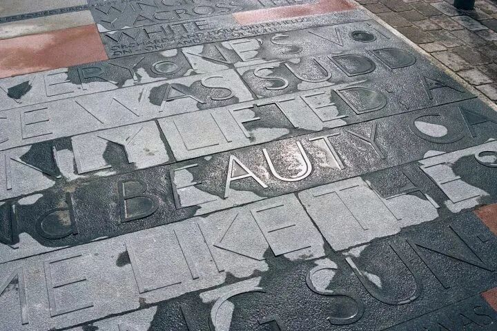 位于英国莫克姆湾的“A flock of word”是由Why Not Associates与艺术家GordonYoung合作完成的。项目内容选取了有关于鸟的词句,内容的选取范围包括莎士比亚、伯恩斯等大师的著作和《圣经》等文学经典,并放置在长达300m的城市道路中。整体艺术铺装是由花岗岩、混凝土、钢、黄铜和青铜制成。