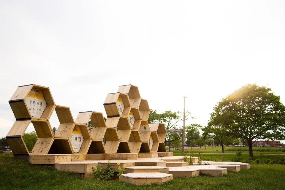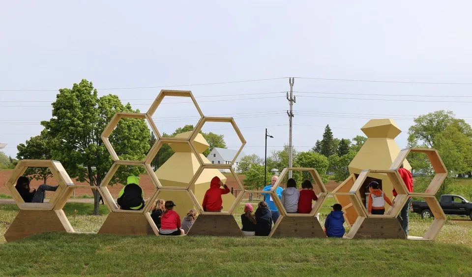位于加拿大的“城市蜂巢”项目是一个位于PEI Farm Centre城市公园的社区性项目,建筑师设置这个艺术装置旨在强调传粉昆虫的重要性和它们在可持续环境中的重要作用。项目由两个示范性的蜂箱以及一个边长为3英尺的六边形体块搭建而成的三层露天剧场。由六边形装置搭建的剧场“PlanBee”很好的融入了景观环境,其间还种植了蜜蜂喜欢的花卉。蜂巢被设置在这个如同雕塑的蜂箱中,在为大众提供学习平台的同时,也作为公共艺术品装点公园环境。人们可以通过两个窗口(分别为成人高度和儿童高度)观察在树脂玻璃巢内工作的蜜蜂,或者在“着落平台”进出的蜜蜂。