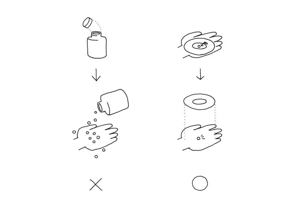 The structure of the former portable case was such that it dispensed medication when the user opened the cover and tilted the case, but sometimes pills came out more than should be taken, or they rolled out of the user’s hand. With this in mind, the body of the newly designed pill case is shaped like a donut and dispenses pills into the central hole. The user first places the case upon their palm and then turns the upper component 60 degrees counter-clockwise to reveal a slot. The slot was designed to face the user so the latter might easily see pills before dispensing. Then, gently tilted toward the user, the pill case releases one to two pills onto the user’s palm, from which the pills may be taken after the case is lifted.